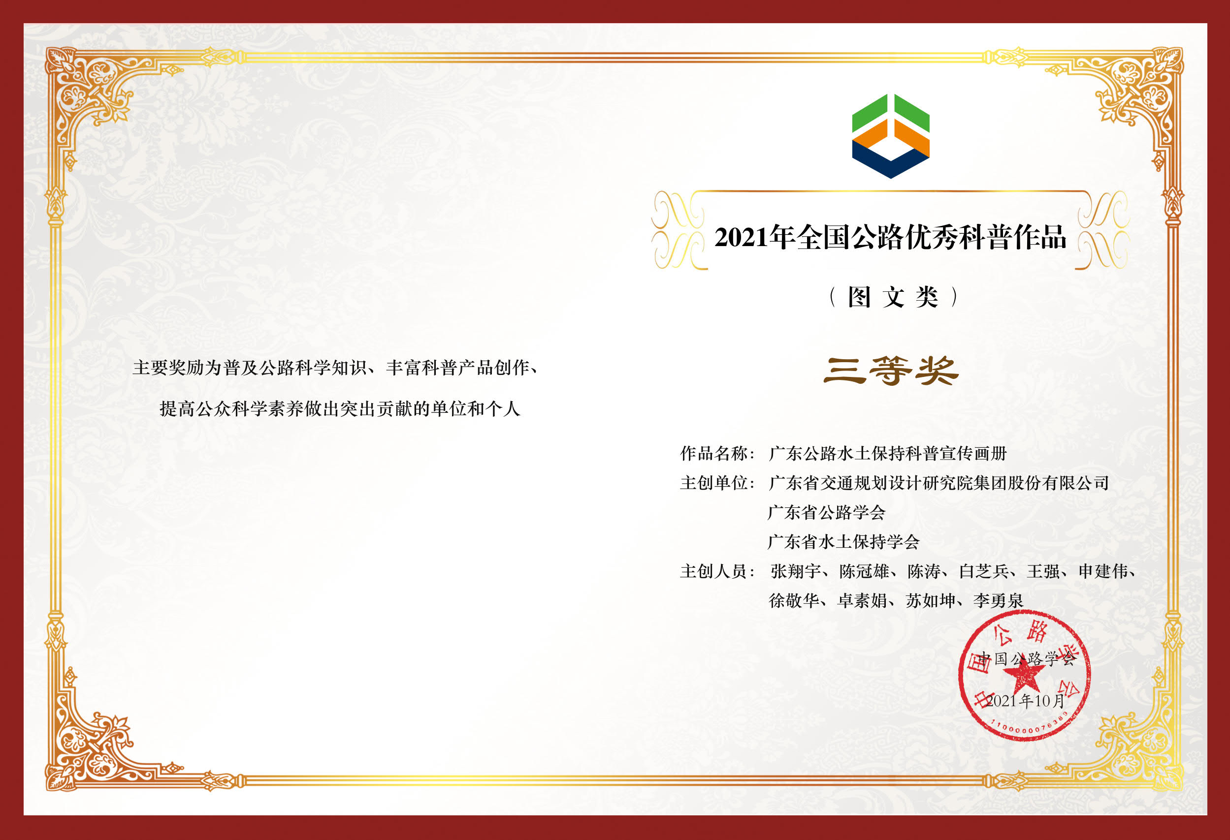 近日,中國公路學會表彰了一批“2021年全國公路優(yōu)秀科普作品”。我公司主編的科普宣傳作品《廣東公路水土保持宣傳畫冊》喜獲2021年全國公路優(yōu)秀科普作品圖文類三等獎。