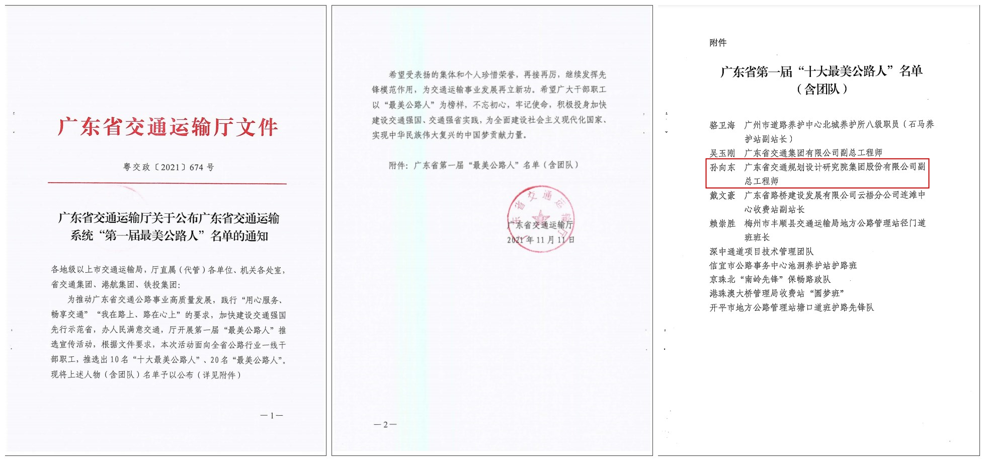 為大力弘揚新時代交通精神,發(fā)掘宣傳公路交通行業(yè)“最美”典型,加快建設交通強國先行示范省,近期廣東省交通運輸廳組織開展了第一屆“最美公路人”推選活動,我公司副總工程師孫向東喜獲廣東省交通運輸廳授予“廣東交通運輸系統(tǒng)‘第一屆最美公路人’”榮譽稱號。