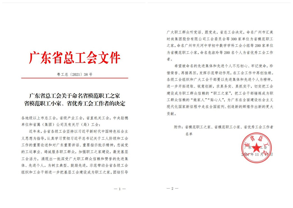 近日,從廣東省總工會(huì)傳來喜訊,我公司榮獲“廣東省模范職工之家”稱號(hào)。這是集團(tuán)公司首次獲得該項(xiàng)榮譽(yù),是對(duì)集團(tuán)公司工會(huì)圍繞中心,服務(wù)大局,切實(shí)做好職工“娘家人”、“貼心人”的肯定,特此報(bào)喜!