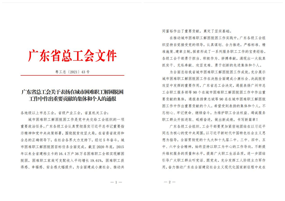 12月20日,廣東省總工會以電視電話會議形式召開了全省城市困難職工解困脫困工作總結(jié)表彰會。會議總結(jié)了五年來全省各級工會推進(jìn)城市困難職工解困脫困工作取得的重大成就,并表揚了一批在工作中真抓實干、無私奉獻(xiàn)、攻堅克難、勇于創(chuàng)新的先進(jìn)集體和個人。我公司被省總工會授予“在城市困難職工解困脫困工作中作出重要貢獻(xiàn)集體”榮譽稱號!
