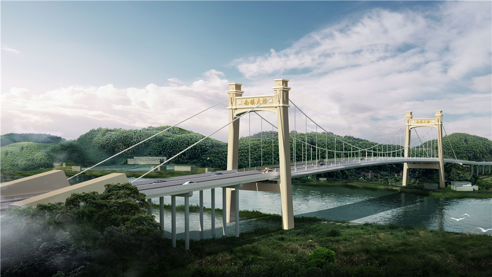南鎮(zhèn)大橋主橋?yàn)椋?3.5+218+82)m單跨吊組合梁地錨式懸索橋,建成后將成為江門(mén)市首座懸索橋。在施工圖設(shè)計(jì)階段,針對(duì)本項(xiàng)目建設(shè)條件復(fù)雜、建設(shè)資金受限、景觀效果要求高、管養(yǎng)要求簡(jiǎn)單便捷等特點(diǎn),集團(tuán)在中小跨徑懸索橋纜索系統(tǒng)、主梁結(jié)構(gòu)形式、錨碇設(shè)置、錨固系統(tǒng)和景觀創(chuàng)意等方面進(jìn)行了深入研究。