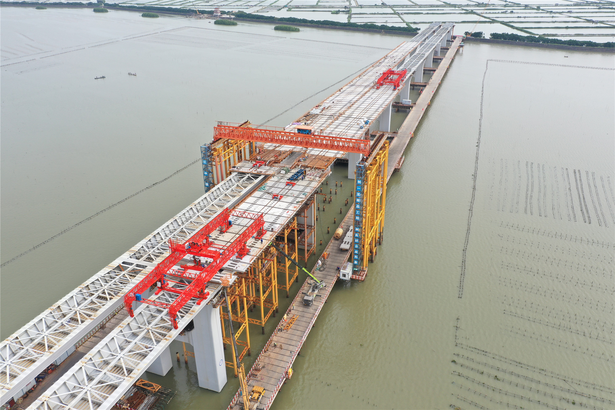 汕頭市牛田洋快速通道工程起點(diǎn)位于汕頭市城區(qū)西側(cè),路線長(zhǎng)15.8km,主線橋梁總長(zhǎng)14.2km。項(xiàng)目設(shè)計(jì)施工難度大,涉及抗風(fēng)、抗震、防腐、防撞、公軌合建等復(fù)雜因素。牛田洋大橋采用主跨 468m半漂浮體系雙塔雙索面鋼桁梁斜拉橋,上層公路、下層軌道斷面布置方式;軌道交通采用跨座式單軌制式。水中引橋?yàn)?span>70~80m分層布置鋼混組合梁,采用上、下層同步頂推施工方案;陸上引橋?yàn)?span>30~75m鋼混組合梁,采用雙槽型無(wú)中橫梁體系。鋼混組合梁為廣東省首次大規(guī)模采用。