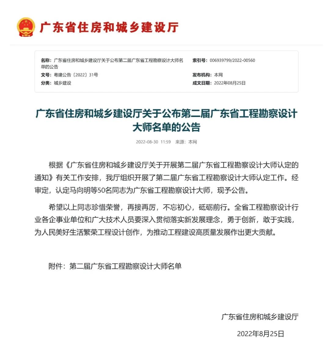 8月30日,廣東省住房和城鄉(xiāng)建設廳發(fā)布《關于公布第二屆廣東省工程勘察設計大師名單的公告》,集團首席專家梁立農(nóng)、集團副總工程師劉吉福成功當選為廣東省工程勘察設計大師!