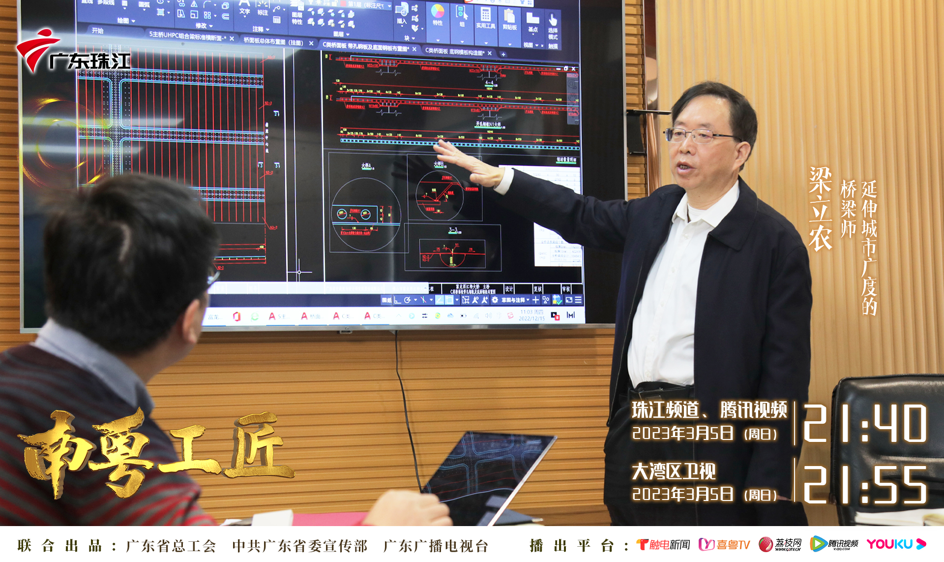 廣東省交通規(guī)劃設(shè)計(jì)研究院集團(tuán)股份有限公司首席專家、全國(guó)十大橋梁人物、廣東省工程勘察設(shè)計(jì)大師、中國(guó)公路學(xué)會(huì)優(yōu)秀科技工作者、全國(guó)公路優(yōu)秀勘察設(shè)計(jì)師、廣東省五一勞動(dòng)獎(jiǎng)?wù)?、“南粵工匠”梁立農(nóng)的個(gè)人專題紀(jì)錄片《南粵工匠——延伸城市廣度的橋梁師》于2023年3月6日在珠江頻道、大灣區(qū)衛(wèi)視以及騰訊視頻、優(yōu)酷、喜粵TV、廣州地鐵電視等新媒體平臺(tái)與觀眾見面。