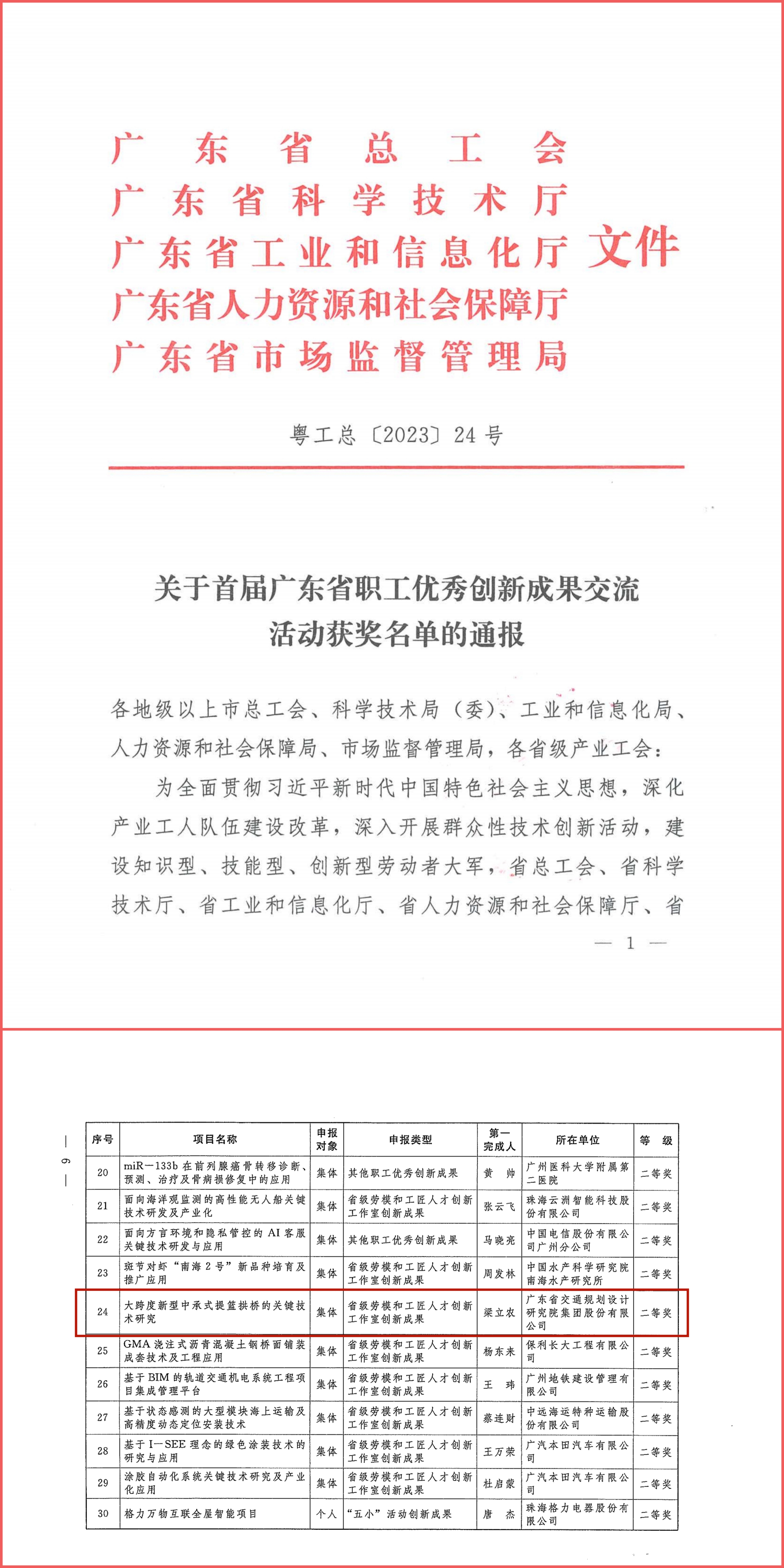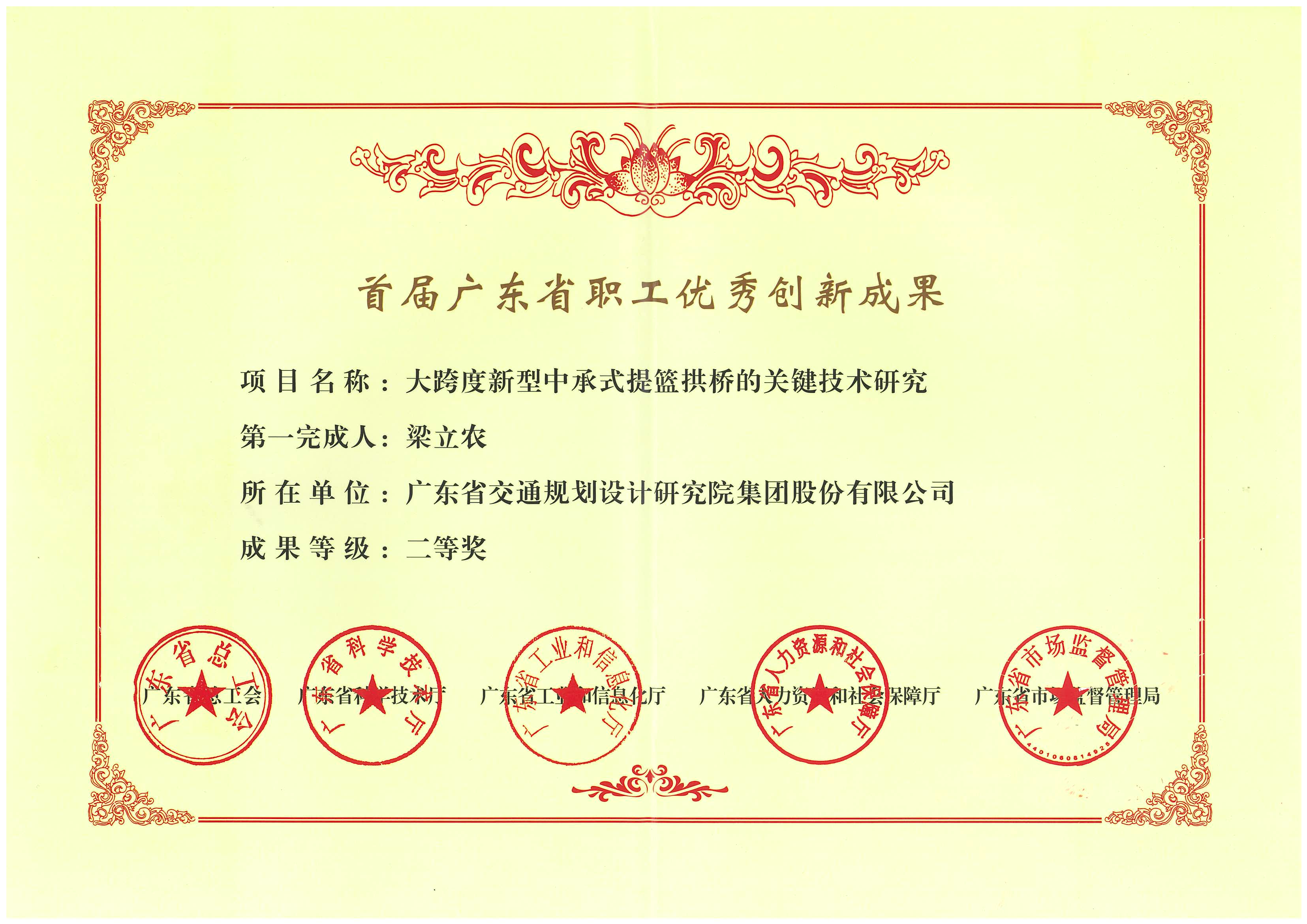 近日,公司梁立農(nóng)創(chuàng)新工作室《大跨度新型中承式提籃拱橋的關(guān)鍵技術(shù)研究》項(xiàng)目獲廣東省職工優(yōu)秀創(chuàng)新成果二等獎(jiǎng)。