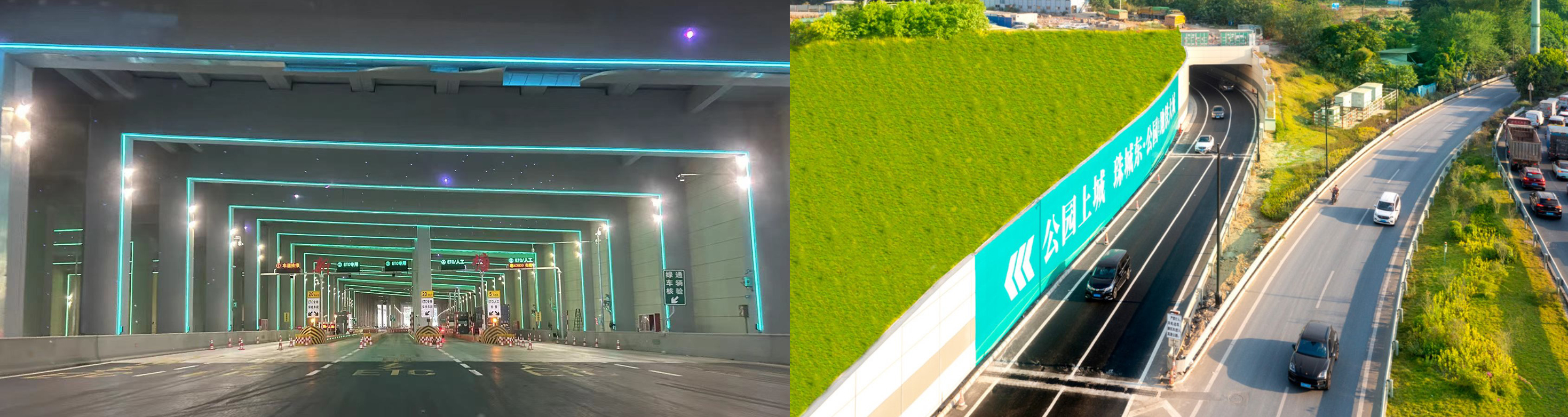 基于該項目的特點,項目組在設(shè)計過程中,除了滿足行車功能之外,也對司乘和外界人員的感官體驗進行了充分考慮:主線兩端設(shè)有“大鵬展翅”造型,彰顯廣深高速公路的灣區(qū)地位;匝道入口采用“魚躍龍門”裝飾,完美配合主線過渡,避免了單調(diào)的門洞效應(yīng);考慮到收費廣場路段車速較慢,且為封閉空間,采用“時空隧道,繁星點點”景觀照明等。