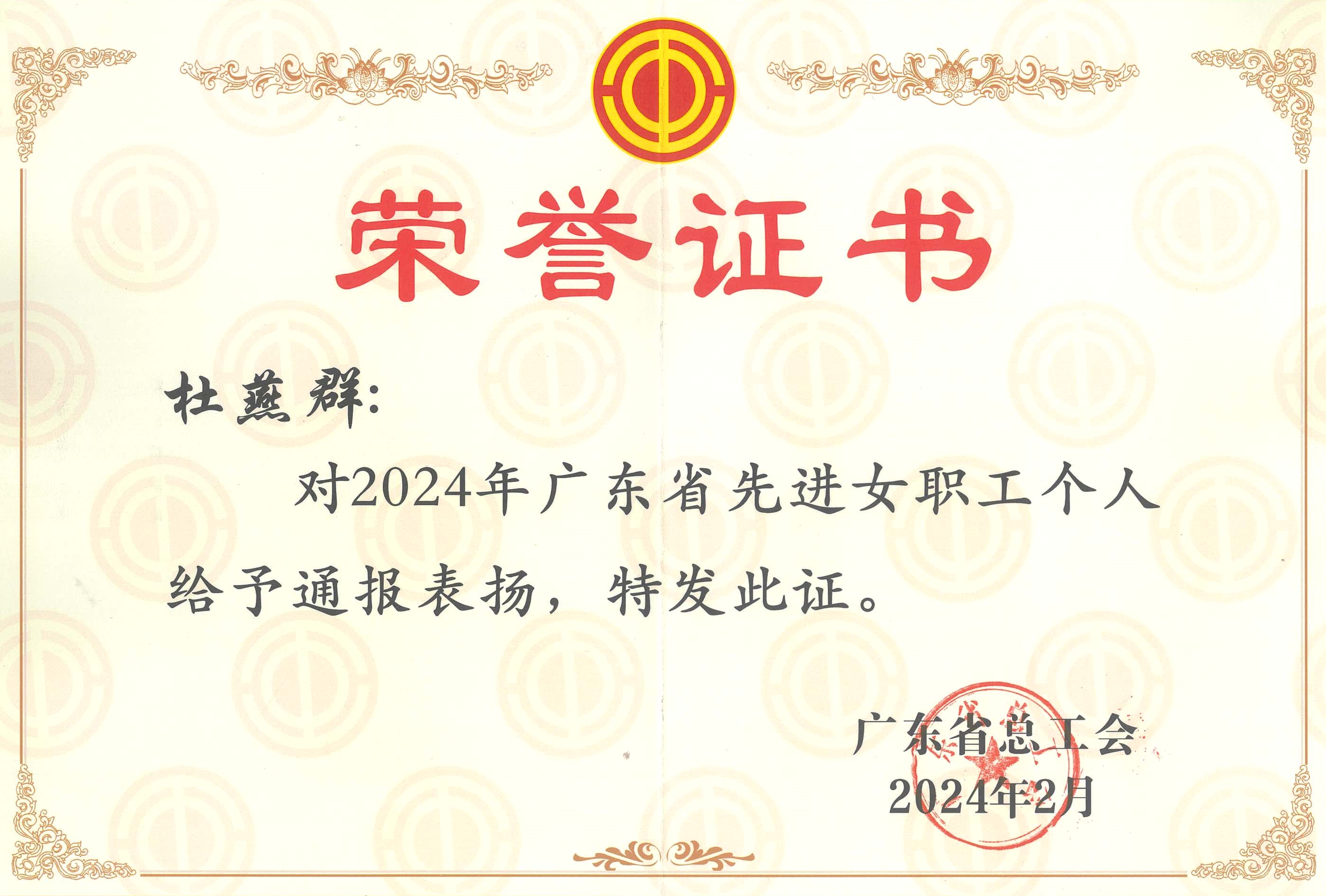 近日,從廣東省總工會(huì)傳來(lái)喜訊,公司副總工程師杜燕群獲廣東省總工會(huì)授予“2024年廣東省先進(jìn)女職工個(gè)人”榮譽(yù)稱(chēng)號(hào),特此報(bào)喜。