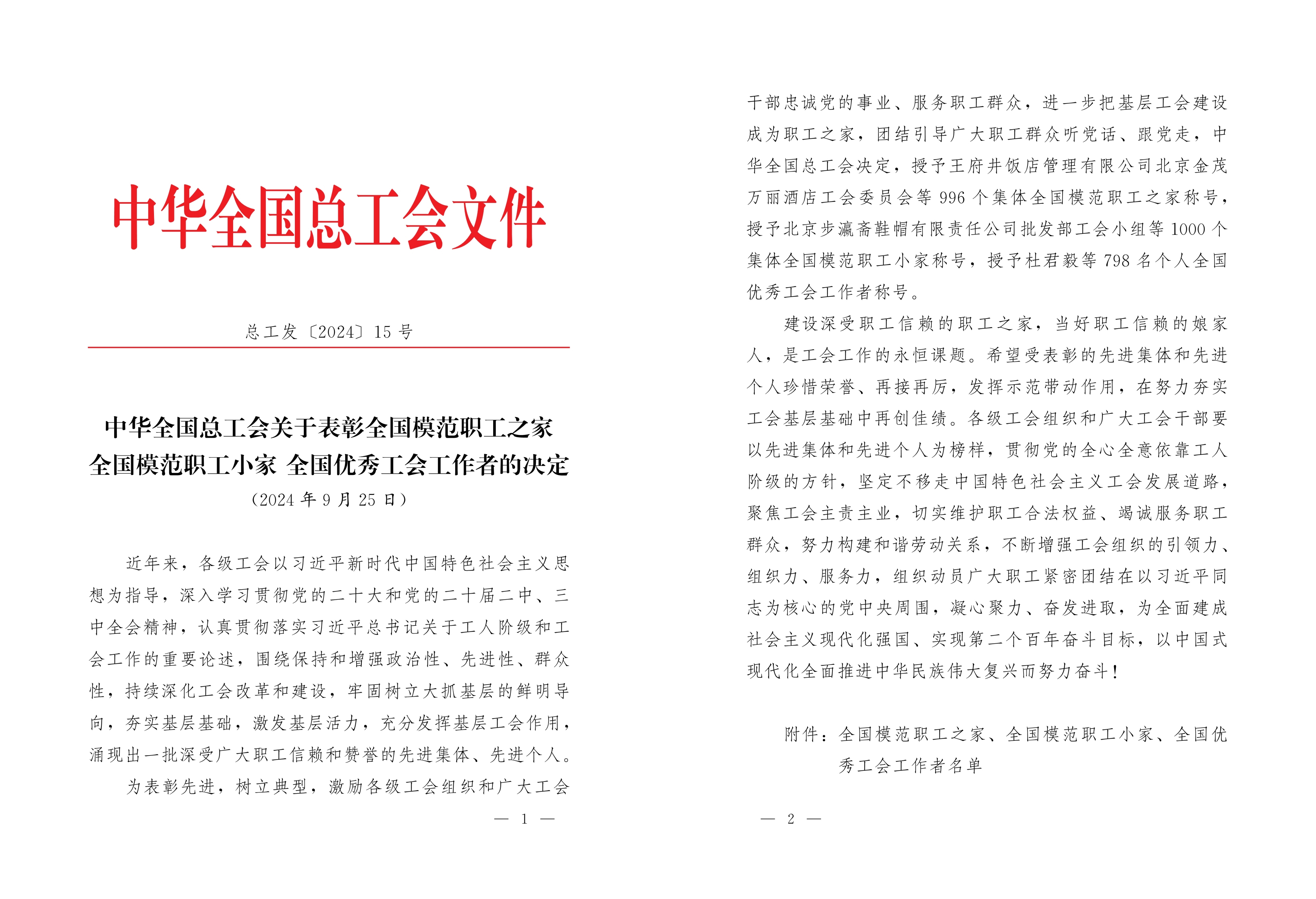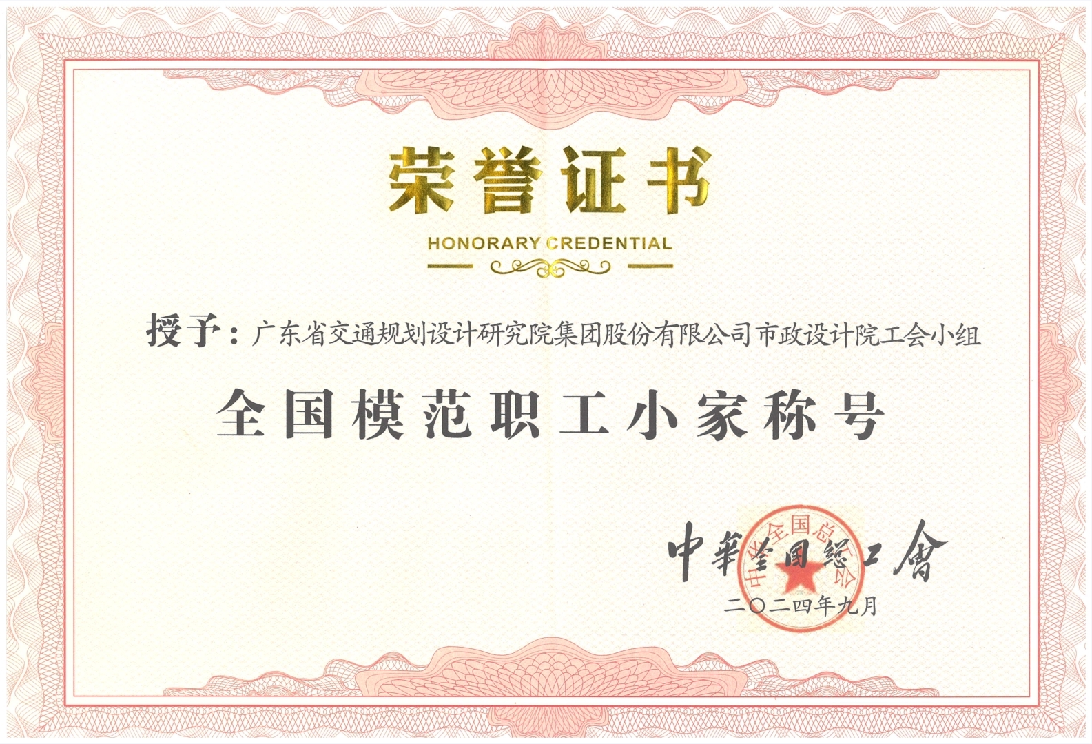 近日,中華全國(guó)總工會(huì)下發(fā)了《中華全國(guó)總工會(huì)關(guān)于表彰全國(guó)模范職工之家 全國(guó)模范職工小家全國(guó)優(yōu)秀工會(huì)工作者的決定》(總工發(fā)〔2024〕15號(hào)),公司市政設(shè)計(jì)院工會(huì)小組榮獲2023年度“全國(guó)模范職工小家”榮譽(yù)稱號(hào)。