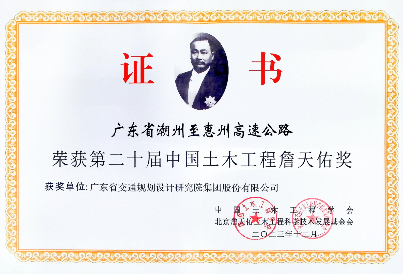 近日,中國(guó)土木工程學(xué)會(huì)2024年學(xué)術(shù)年會(huì)、第二十屆中國(guó)土木工程詹天佑獎(jiǎng)?lì)C獎(jiǎng)大會(huì)在蘇州舉行,由公司負(fù)責(zé)的勘察設(shè)計(jì)項(xiàng)目-廣東省潮州至惠州高速公路(以下簡(jiǎn)稱(chēng)“潮惠高速公路”)榮獲“第二十屆中國(guó)土木工程詹天佑獎(jiǎng)”。