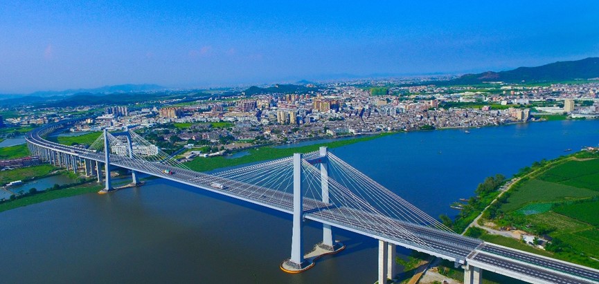 為有效解決海運(yùn)對(duì)橋梁下部?jī)艨找蠛惋w機(jī)航線對(duì)橋塔凈高限制的矛盾,首創(chuàng)大跨徑混合梁柔梁密索矮塔斜拉橋體系,主橋跨徑布置為60m+70m+380m+70m+60m=640m;首創(chuàng)全焊整體式鋼錨箱索塔錨固技術(shù);首次研發(fā)縱橫向正交分離減隔震技術(shù)和鋼阻尼滑板支座、可調(diào)高隔震支座。榮獲廣東省土木建筑學(xué)會(huì)科學(xué)技術(shù)一等獎(jiǎng)、中國(guó)公路學(xué)會(huì)科學(xué)技術(shù)二等獎(jiǎng)。