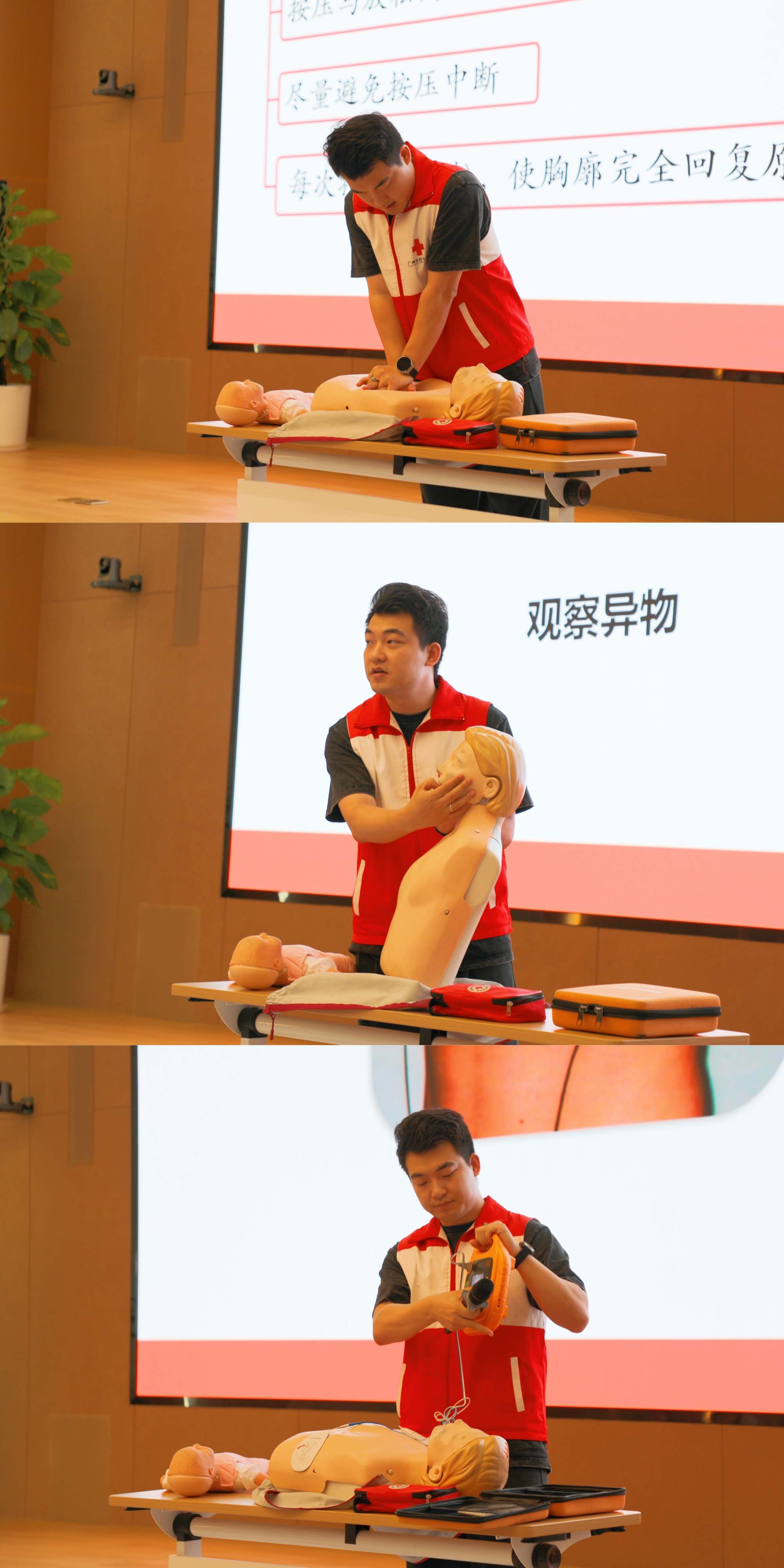 隨后,講師請員工上臺配合演示止血包扎、氣道梗阻的急救實操方法,并邀請大家進(jìn)行心肺復(fù)蘇術(shù)、AED除顫儀的使用實操練習(xí)。大家通過講解人員手把手的指導(dǎo),熟悉并掌握了急救要領(lǐng)。