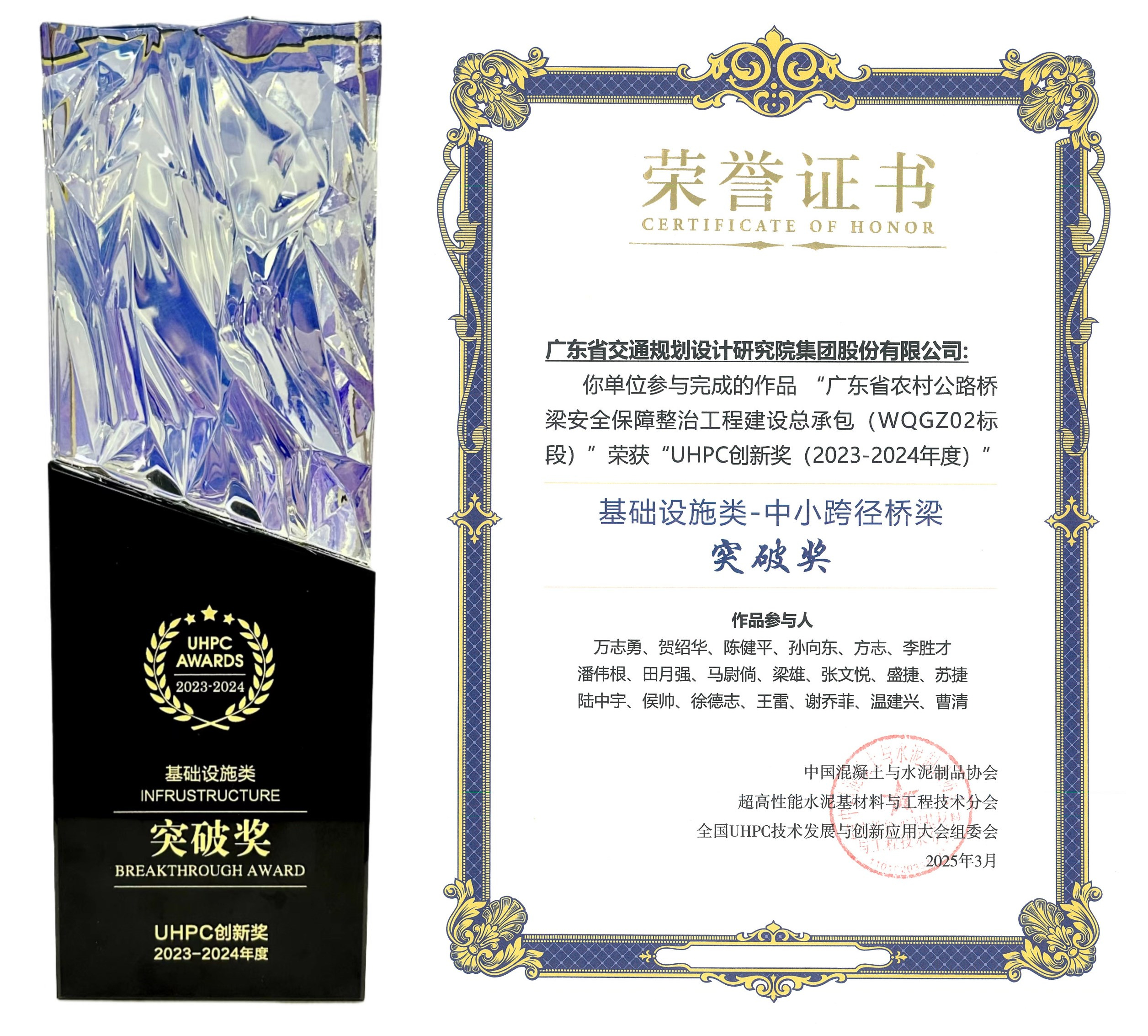 近日,中國混凝土與水泥制品協(xié)會超高性能水泥基材料與工程技術(shù)分會(簡稱CCPA-UHPC分會)主辦的第二屆全國UHPC技術(shù)發(fā)展和創(chuàng)新應(yīng)用大會在武漢隆重召開。公司承擔(dān)的“廣東省農(nóng)村公路橋梁安全保障整治工程建設(shè)總承包(WQGZ02標(biāo)段)”項(xiàng)目榮獲大會頒發(fā)的“UHPC創(chuàng)新獎(2023-2024年度)基礎(chǔ)設(shè)施類突破獎”。公司總工程師孫向東、副總工程師萬志勇,養(yǎng)護(hù)設(shè)計(jì)院總工程師武建中、副總工程師李勝才等參加了會議及頒獎典禮。