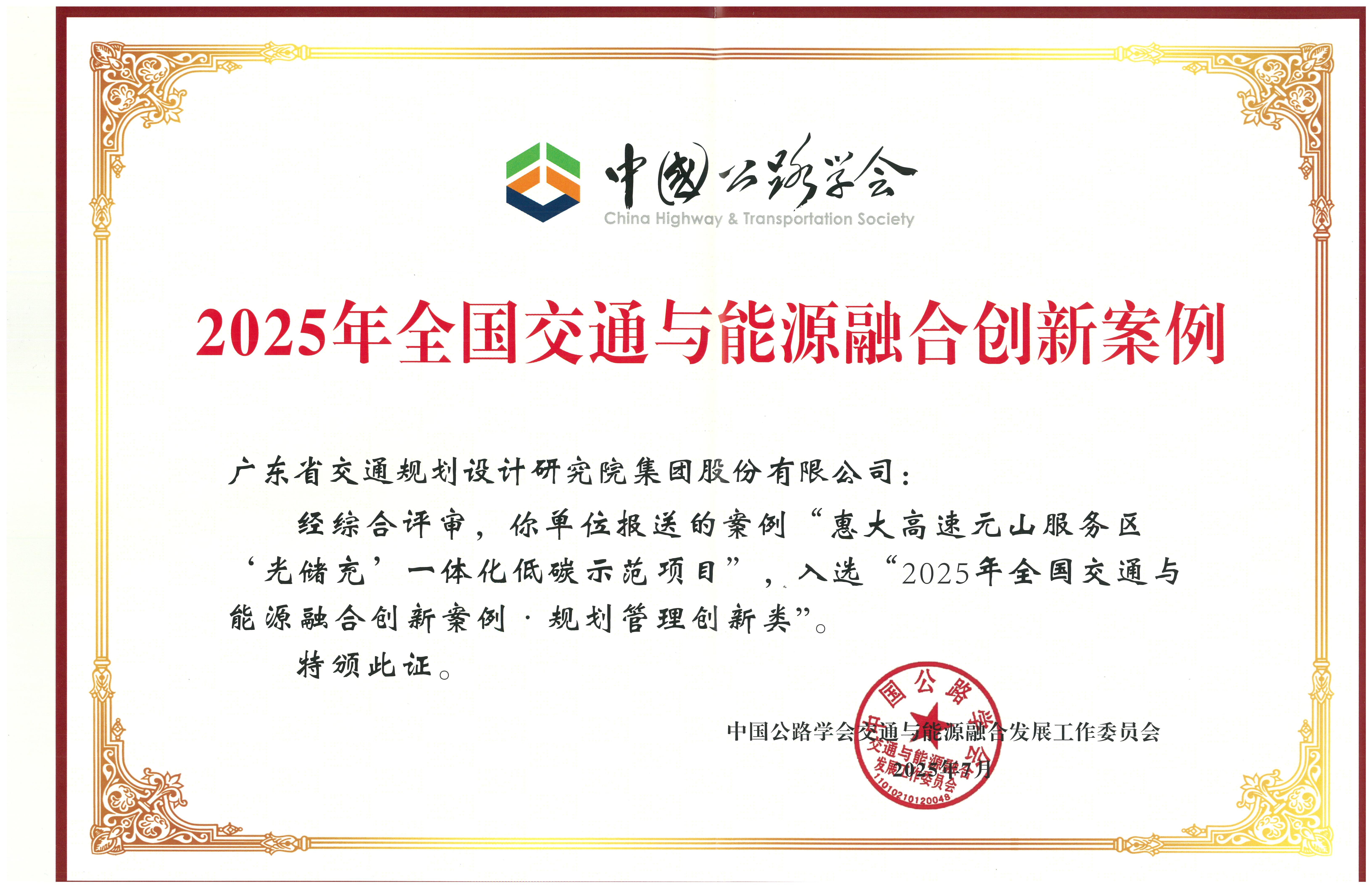 本屆年會(huì)以“綠色引擎 數(shù)智驅(qū)動(dòng)”為主題,共同擘畫(huà)交通與能源深度融合發(fā)展的新藍(lán)圖,集中展示我國(guó)交能融合領(lǐng)域最前沿的研究成果、實(shí)踐標(biāo)桿與權(quán)威洞見(jiàn)。會(huì)議期間,組委會(huì)正式發(fā)布了“2025年全國(guó)交通與能源融合創(chuàng)新案例集”,此次全國(guó)共有64項(xiàng)優(yōu)秀項(xiàng)目入選,其中公司《廣東省交通集團(tuán)高速公路服務(wù)區(qū)超級(jí)充電站建設(shè)規(guī)劃》《惠大高速元山服務(wù)區(qū)“光儲(chǔ)充”一體化低碳示范項(xiàng)目》《址山服務(wù)區(qū)光儲(chǔ)直柔充電站項(xiàng)目》三個(gè)項(xiàng)目入選。