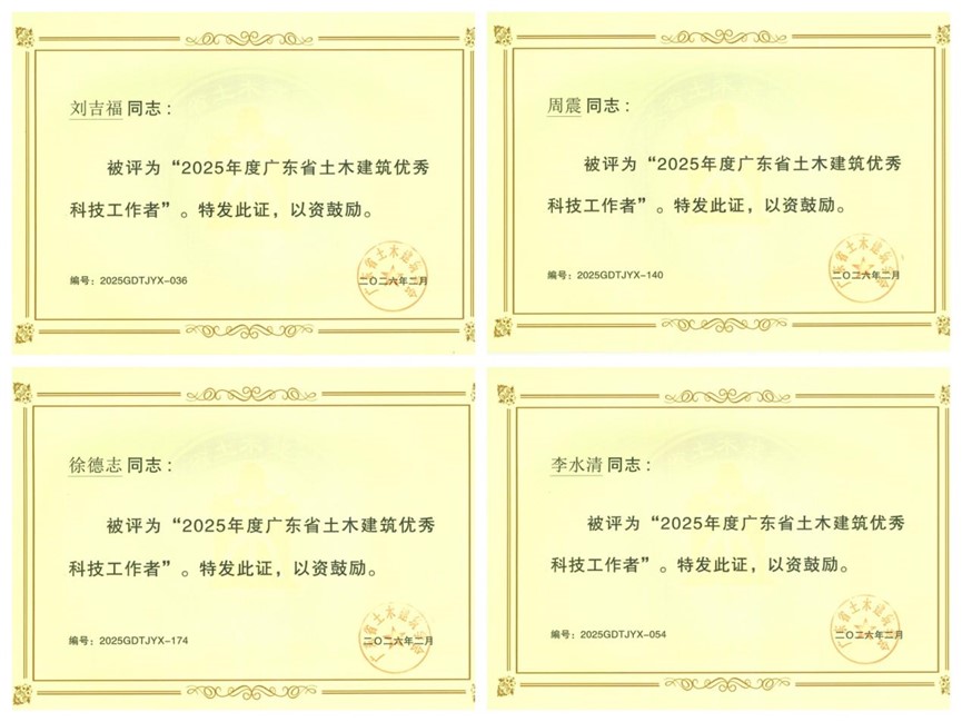 公司劉吉福、周震、徐德志、李水清四位同志憑借深厚專業(yè)造詣、豐碩創(chuàng)新成果與突出工程貢獻(xiàn),榮獲廣東省土木建筑學(xué)會優(yōu)秀科技工作者稱號,這份榮譽(yù)既是對四位同志專業(yè)能力與行業(yè)貢獻(xiàn)的高度認(rèn)可,更是對公司在土木建筑與交通工程領(lǐng)域技術(shù)實(shí)力、人才培養(yǎng)與創(chuàng)新成果的充分肯定。