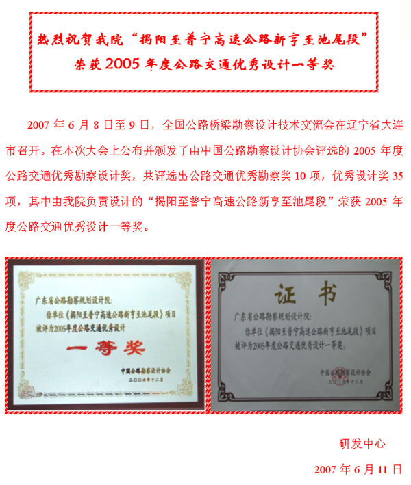 我院“揭陽至普寧高速公路新亨至池尾段”獲05年度公路交通優(yōu)秀設計一等獎