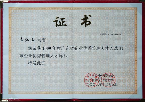 近日,在2009年廣東省企業(yè)發(fā)展高峰論壇上,公司董事長、總經(jīng)理李江山被評(píng)為“廣東省企業(yè)優(yōu)秀管理人才”,并入選《廣東省企業(yè)優(yōu)秀管理人才庫》。 此次評(píng)選活動(dòng),由廣東省企業(yè)聯(lián)合會(huì)、廣東省企業(yè)家協(xié)會(huì)發(fā)起和審核,全省共選出100名企業(yè)優(yōu)秀管理人才。