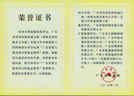 日前,由我司作為主要參建單位之一的廣東省西部沿海高速公路(珠海金鼎至新會(huì)古井段)支線(xiàn)月環(huán)至南屏段工程項(xiàng)目檔案榮獲2009年“廣東省重大建設(shè)項(xiàng)目檔案金冊(cè)獎(jiǎng)”。 “廣東省重大建設(shè)項(xiàng)目檔案金冊(cè)獎(jiǎng)”由省檔案局和省發(fā)改委2007年根據(jù)國(guó)家檔案局和發(fā)改委的有關(guān)精神聯(lián)合設(shè)立,2009年僅有兩個(gè)項(xiàng)目獲此殊榮。