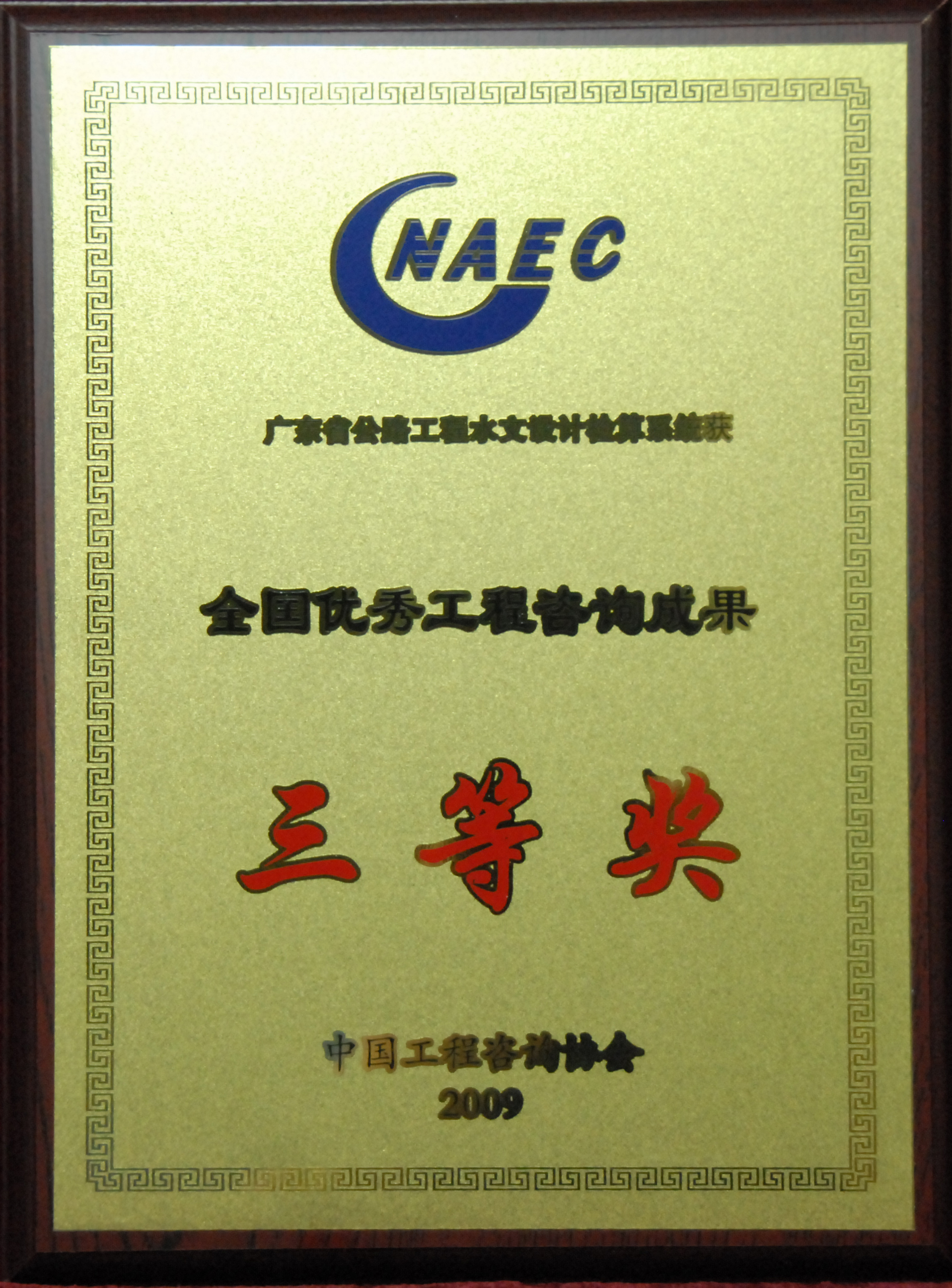 熱烈慶祝: 廣東省公路工程水文設(shè)計(jì)檢算系統(tǒng)項(xiàng)目榮獲 “2009年度全國(guó)優(yōu)秀工程咨詢成果三等獎(jiǎng)” (獲獎(jiǎng)人員名單:文方針、王強(qiáng)、梁立農(nóng)、李江山)