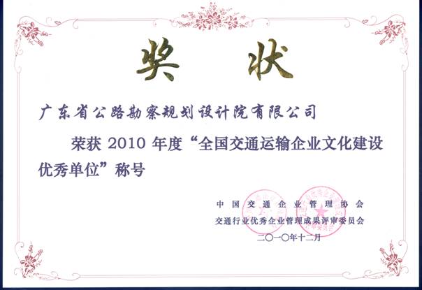 12月4日,第五屆全國交通運輸企業(yè)文化建設(shè)論壇在長沙隆重召開,會上對2010年度全國交通運輸企業(yè)文化建設(shè)優(yōu)秀單位及個人進行了表彰,我司繼2009年后再次榮獲“全國交通運輸企業(yè)文化建設(shè)優(yōu)秀單位“殊榮。 本次論壇由交通運輸部精神文明辦、湖南省交通運輸廳和中國交通企業(yè)管理協(xié)會聯(lián)合主辦,交通運輸部政策法規(guī)司司長、部文明辦主任何建中出席會議并就“十二五”全國交通運輸企業(yè)文化建設(shè)等主題作重要講話。本年度全國共有120個交通運輸單位獲獎,其中公路規(guī)劃勘察設(shè)計單位3家。