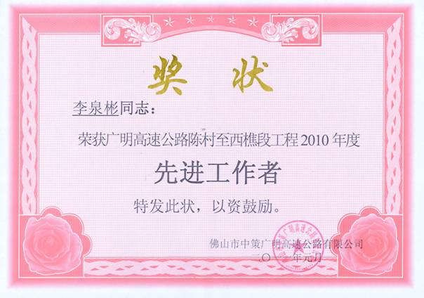 近日,第三路橋設(shè)計部設(shè)計代表李泉彬同志受到業(yè)主單位佛山市中策廣明高速公路有限公司表彰,榮獲廣明高速陳村至西樵段工程2010年度“先進(jìn)工作者”稱號,為公司樹立了良好的外部形象,贏得了榮譽(yù),特表祝賀。