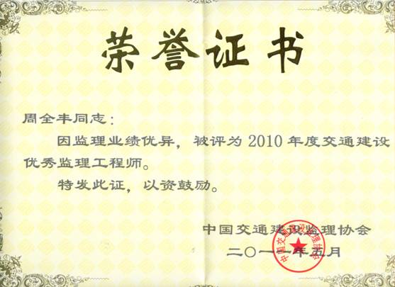 2011年5月26日,在四川召開的中國交通建設(shè)監(jiān)理協(xié)會(huì)三屆二次會(huì)員代表大會(huì)上,翔飛監(jiān)理公司周全豐總監(jiān)受到表彰,榮獲全國“2010年度交通建設(shè)優(yōu)秀監(jiān)理工程師”榮譽(yù)稱號(hào),特此祝賀!