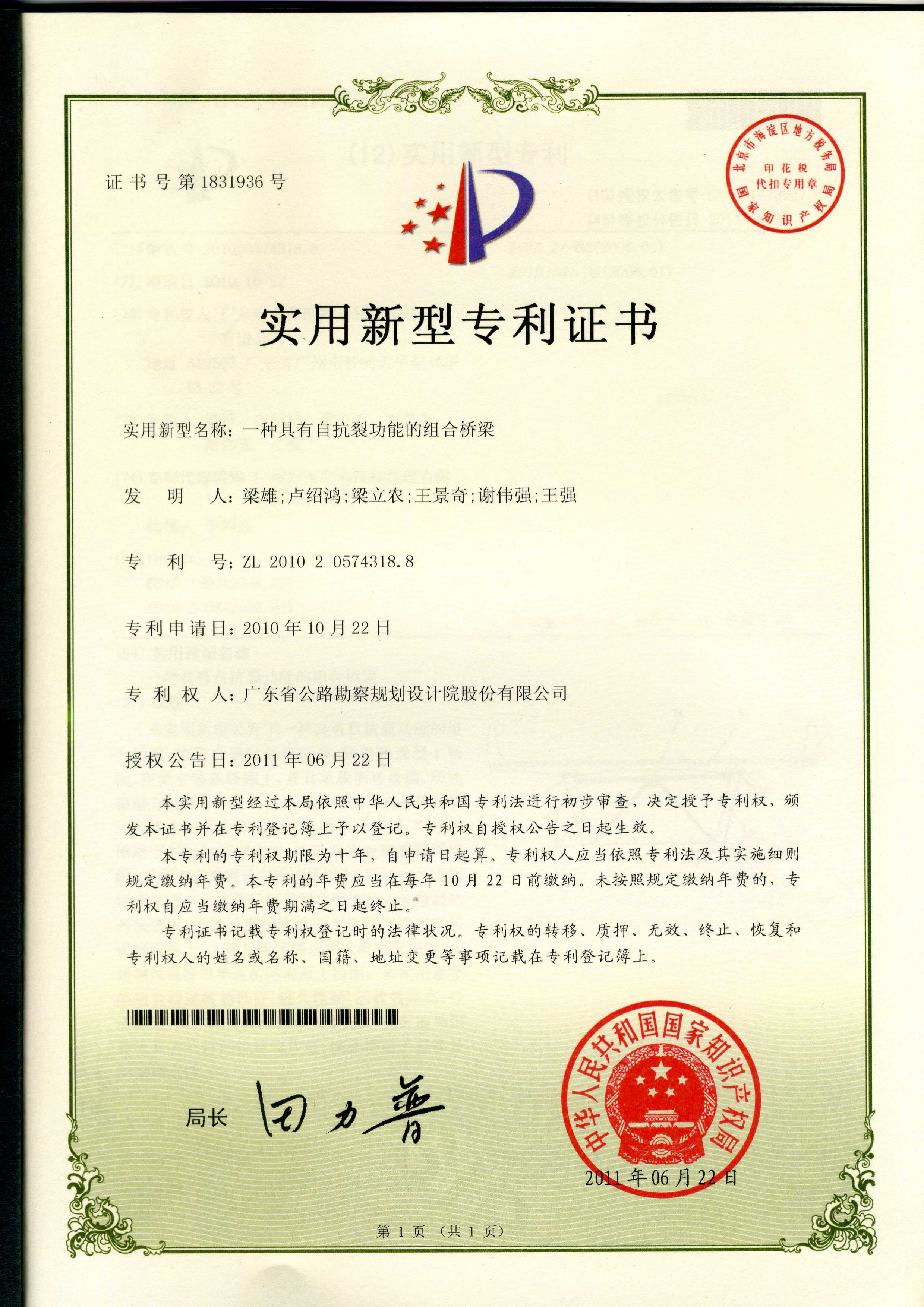 公司研發(fā)的“一種具有自抗裂功能的組合橋梁”技術(shù)成果,于2011年6月22日被中華人民共和國(guó)國(guó)家知識(shí)產(chǎn)權(quán)局授予實(shí)用新型專利權(quán)。