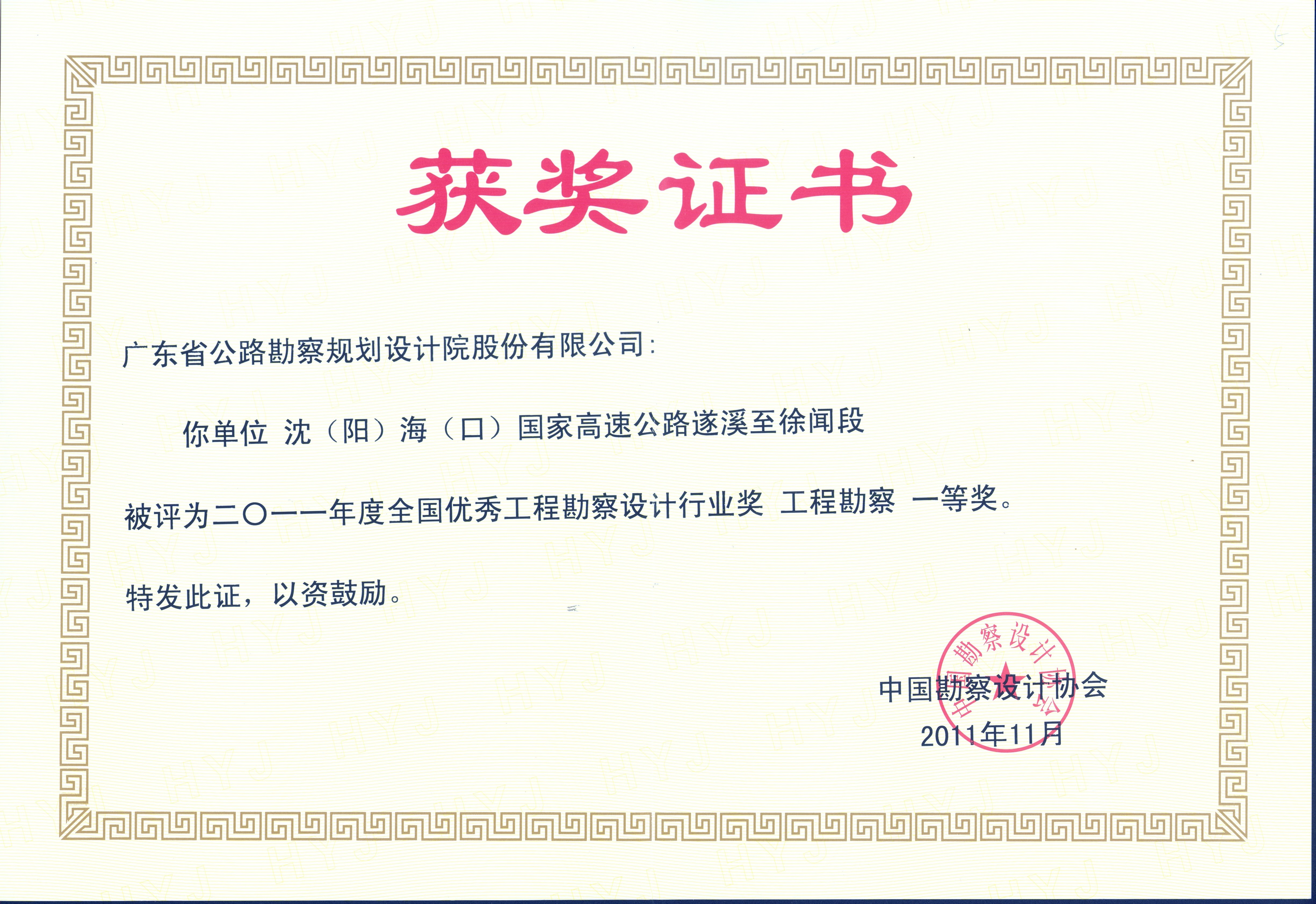 公司完成的四個(gè)項(xiàng)目分別榮獲“2011年度全國(guó)優(yōu)秀工程勘察設(shè)計(jì)行業(yè)獎(jiǎng) 工程勘察一、二、三等獎(jiǎng)”