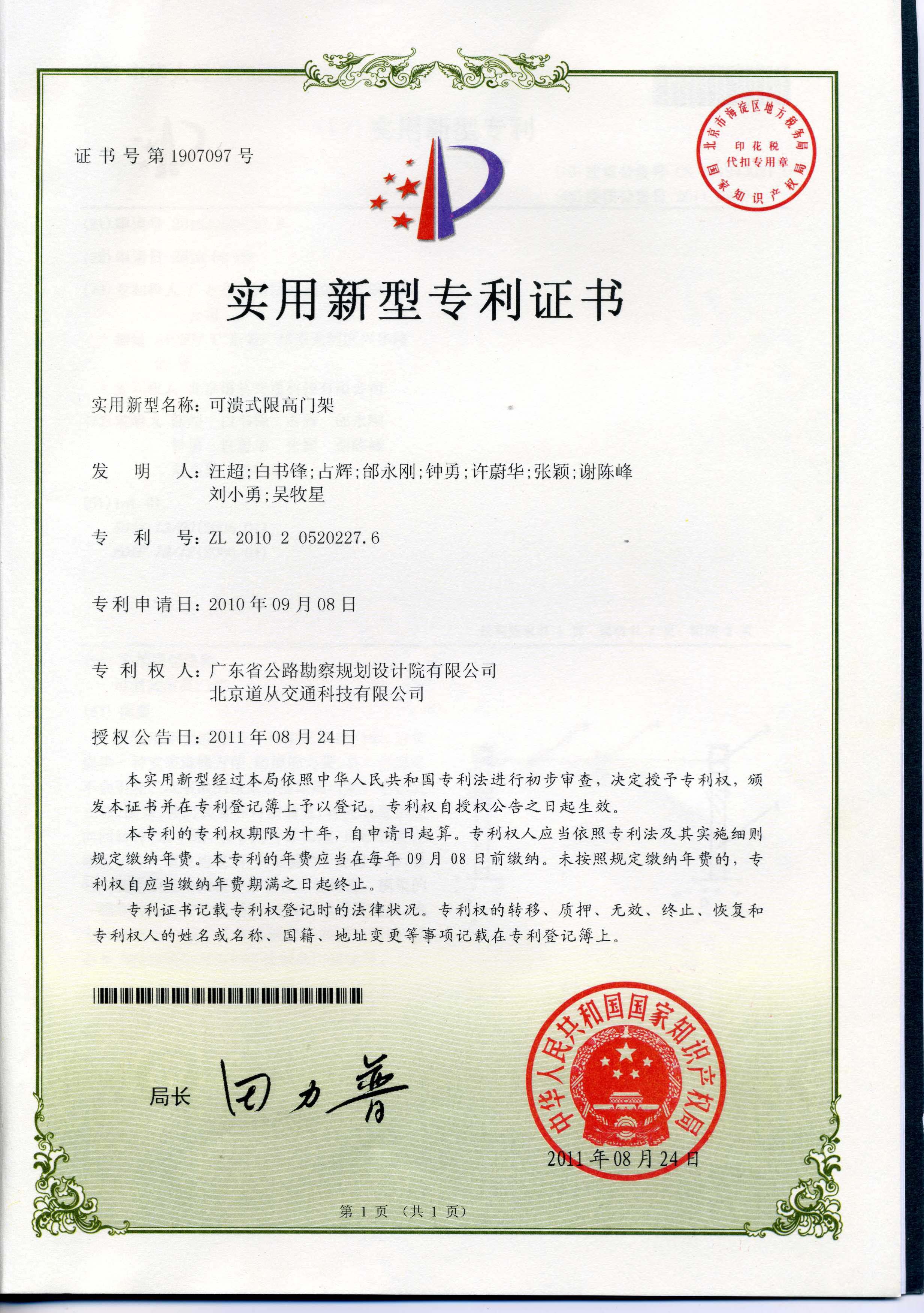公司研發(fā)的“可潰式限高門架”,于2011年8月24日被中華人民共和國國家知識產(chǎn)權(quán)局授予實(shí)用新型專利權(quán)。