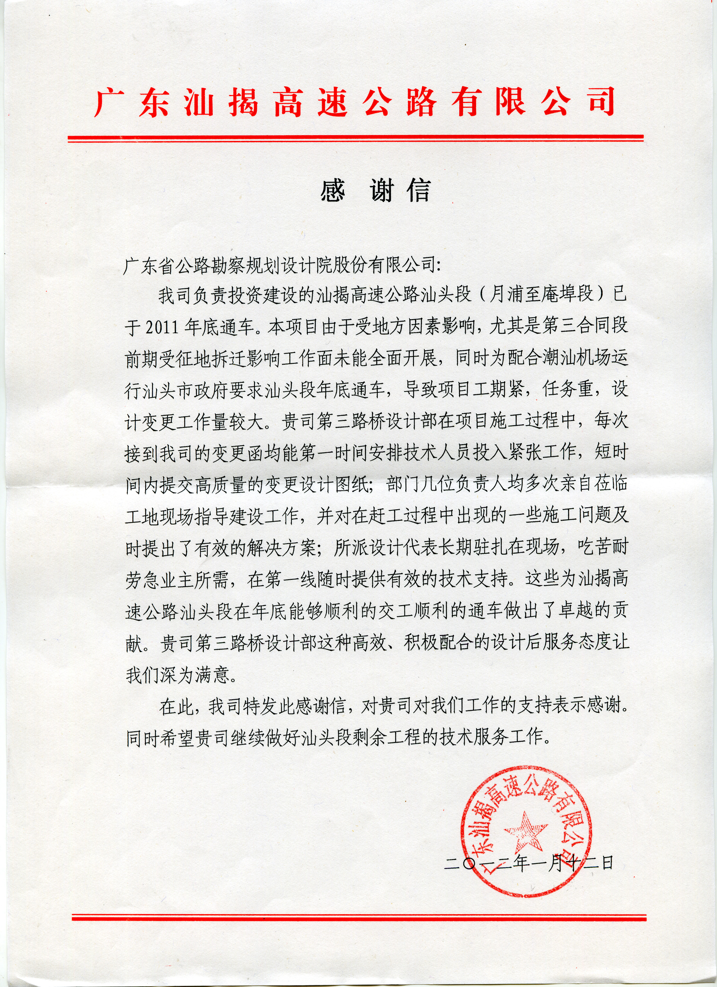 公司設(shè)計(jì)后服務(wù)工作獲得業(yè)主單位廣東汕揭高速公路有限公司的好評。該司近日特別發(fā)來感謝信,對第三路橋設(shè)計(jì)部在汕揭高速公路汕頭段(月浦至庵埠段)設(shè)計(jì)后服務(wù)中的優(yōu)異表現(xiàn)給予了充分肯定和高度贊揚(yáng)。第三路橋設(shè)計(jì)部王春明同志被汕揭公司評為“優(yōu)秀設(shè)計(jì)代表”。特表祝賀。