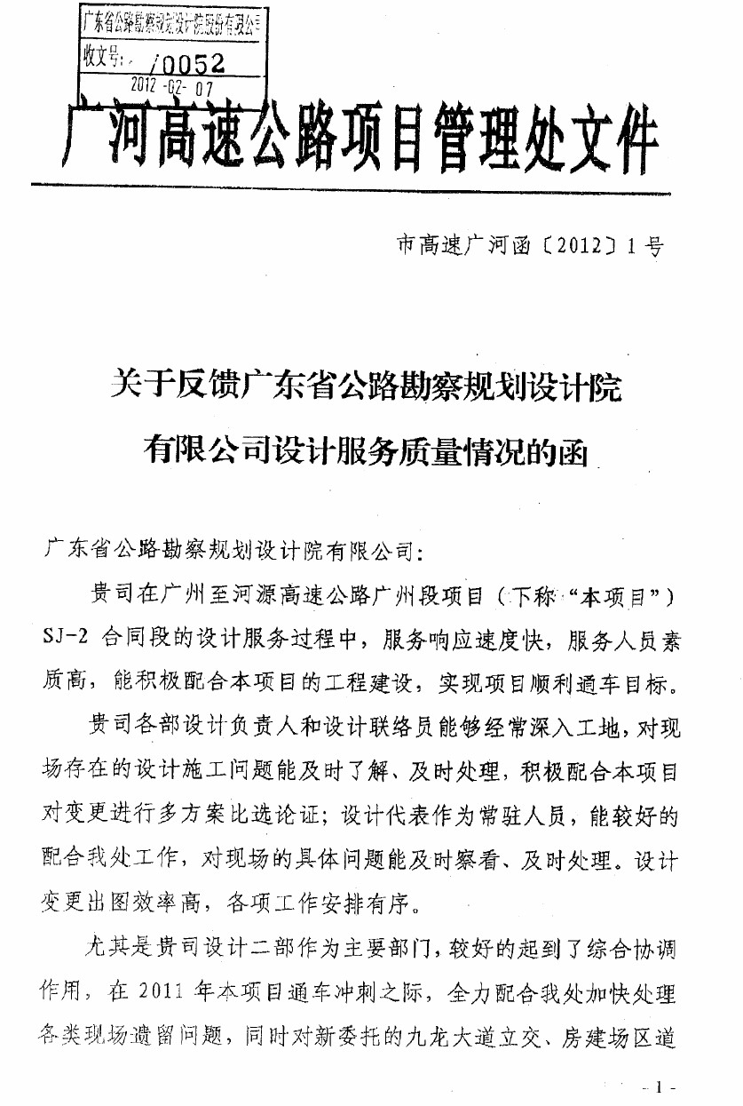 近日,業(yè)主單位廣河高速公路項目管理處專函盛贊公司設(shè)計后服務(wù)工作,并對以第二路橋設(shè)計部為主的服務(wù)團隊在廣州至河源高速公路廣州段設(shè)計后服務(wù)中的優(yōu)異表現(xiàn)給予了充分肯定和高度贊揚,認為我司設(shè)計服務(wù)水平“優(yōu)秀”,對我司的服務(wù)質(zhì)量表示“十分滿意”。