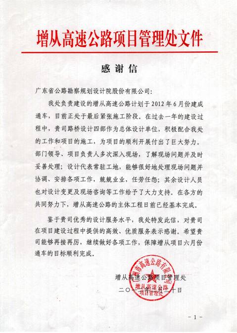 近日,增從高速公路項(xiàng)目管理處發(fā)來感謝信,對第四路橋設(shè)計(jì)部在增從高速公路建設(shè)中提供的“高效、優(yōu)質(zhì)”的設(shè)計(jì)后服務(wù)給予了充分肯定和高度贊揚(yáng)。這是今年以來,我司設(shè)計(jì)后服務(wù)工作第三次受到業(yè)主單位來函表揚(yáng)。特表祝賀!