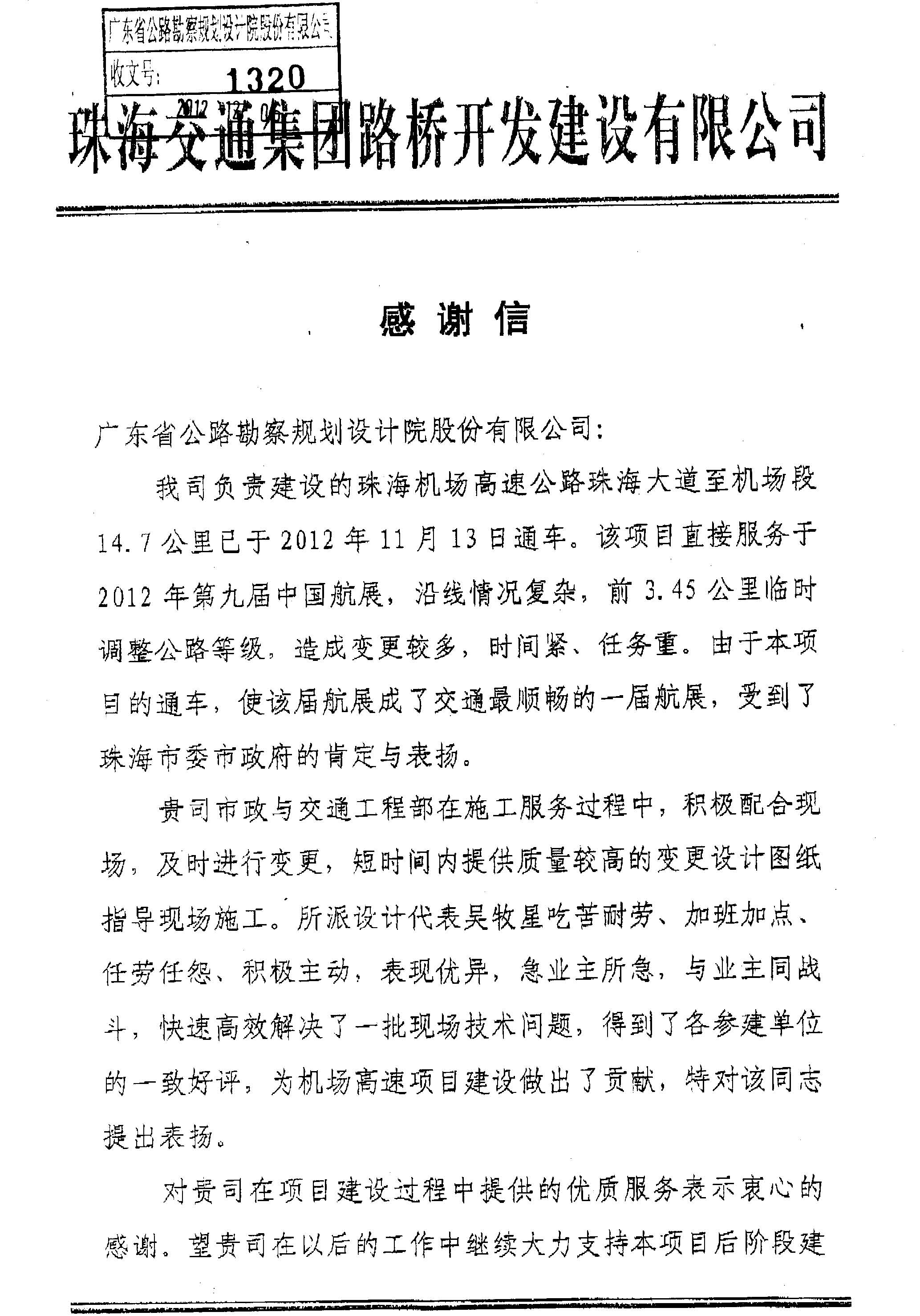 近日,珠海交通集團(tuán)有限公司珠海機(jī)場高速公路項(xiàng)目管理部發(fā)來感謝信,對公司市政與交通工程部團(tuán)隊(duì)在珠海機(jī)場高速珠海大道至機(jī)場段項(xiàng)目中提供的“優(yōu)質(zhì)服務(wù)”表示滿意和感謝。目前該項(xiàng)目已經(jīng)完工通車,為第九屆中國航展提供了順暢的交通服務(wù)。