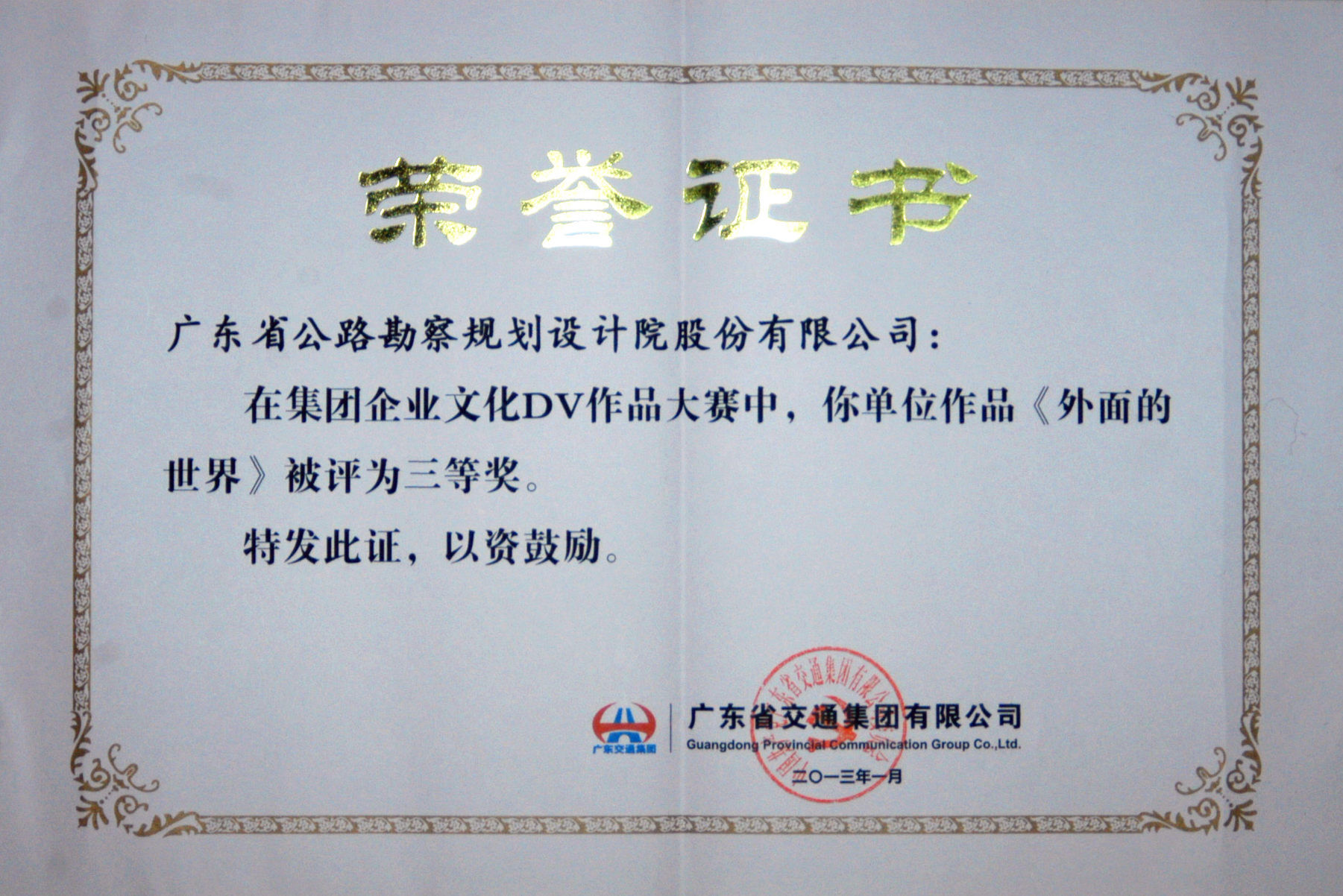 省交通集團(tuán)企業(yè)文化DV作品大賽獲獎(jiǎng)名單近日揭曉,我司共推薦了7件DV作品參選,其中,由行政事務(wù)部張安靜編輯制作的《外面的世界》在眾多優(yōu)秀作品中脫穎而出,榮獲本次比賽三等獎(jiǎng)。