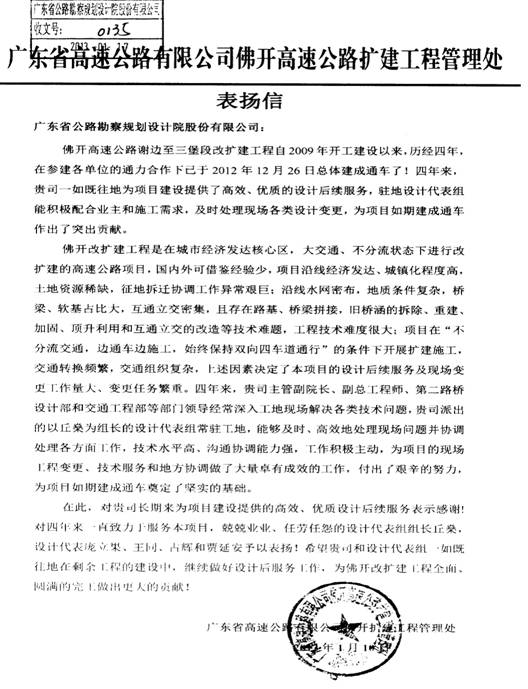 近日,佛開擴建工程管理處發(fā)來表揚信,高度肯定我司設(shè)計后服務(wù),并對第二路橋分公司設(shè)計代表組丘燊組長、設(shè)計代表龐立果、王同、市政與交通工程設(shè)計部占輝、和立公司賈延安等人在佛開高速公路謝邊至三堡段改擴建項目上的設(shè)計后服務(wù)表示滿意和感謝。特表祝賀!