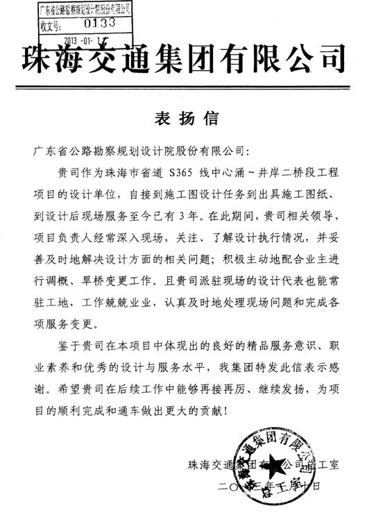 近日,珠海交通集團(tuán)有限公司發(fā)專函表揚(yáng)我司在省道S365線中心涌至井岸二橋段工程中提供的的技術(shù)服務(wù),對我司的精品服務(wù)意識、員工職業(yè)素養(yǎng)和優(yōu)秀的設(shè)計(jì)與服務(wù)水平給予了充分肯定。該項(xiàng)目由市政與交通工程設(shè)計(jì)部承擔(dān)。