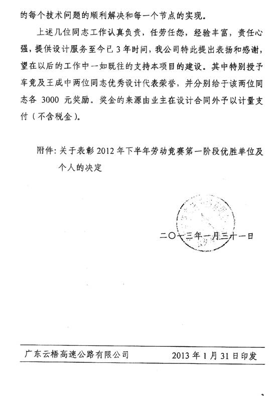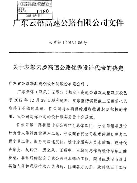 近日,廣東云梧高速公路有限公司發(fā)來表彰決定,高度肯定我司的設計服務質(zhì)量,并對第二路橋分公司設計代表車競、吳玲正、龐立果、和立公司王成中和隧道部王超等人在云浮至岑溪高速公路雙鳳至榃濱段高速公路項目的設計后服務表示滿意和感謝。其中,車競和王成中被評為“優(yōu)秀設計代表”,特表祝賀。