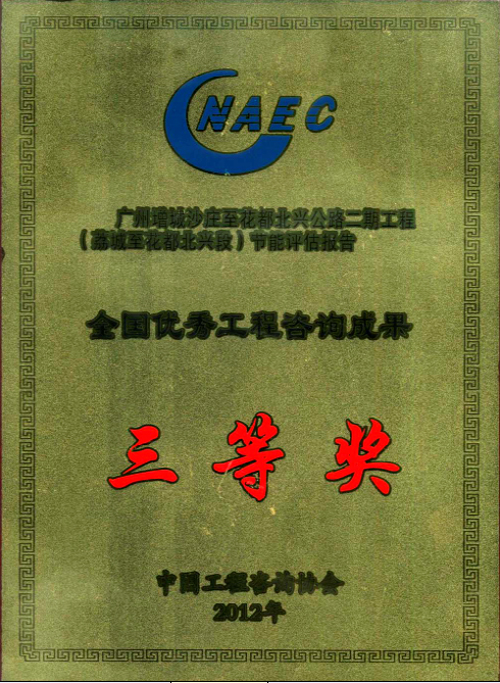 2、廣州增城沙莊至花都北興公路二期工程(荔城至花都北興段)節(jié)能評(píng)估報(bào)告榮獲三等獎(jiǎng)