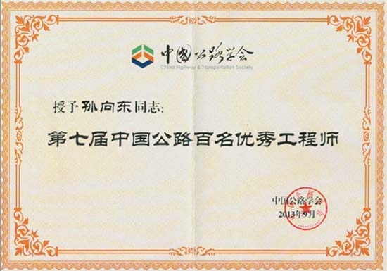 孫向東副總工程師榮獲第七屆中國公路百名優(yōu)秀工程師