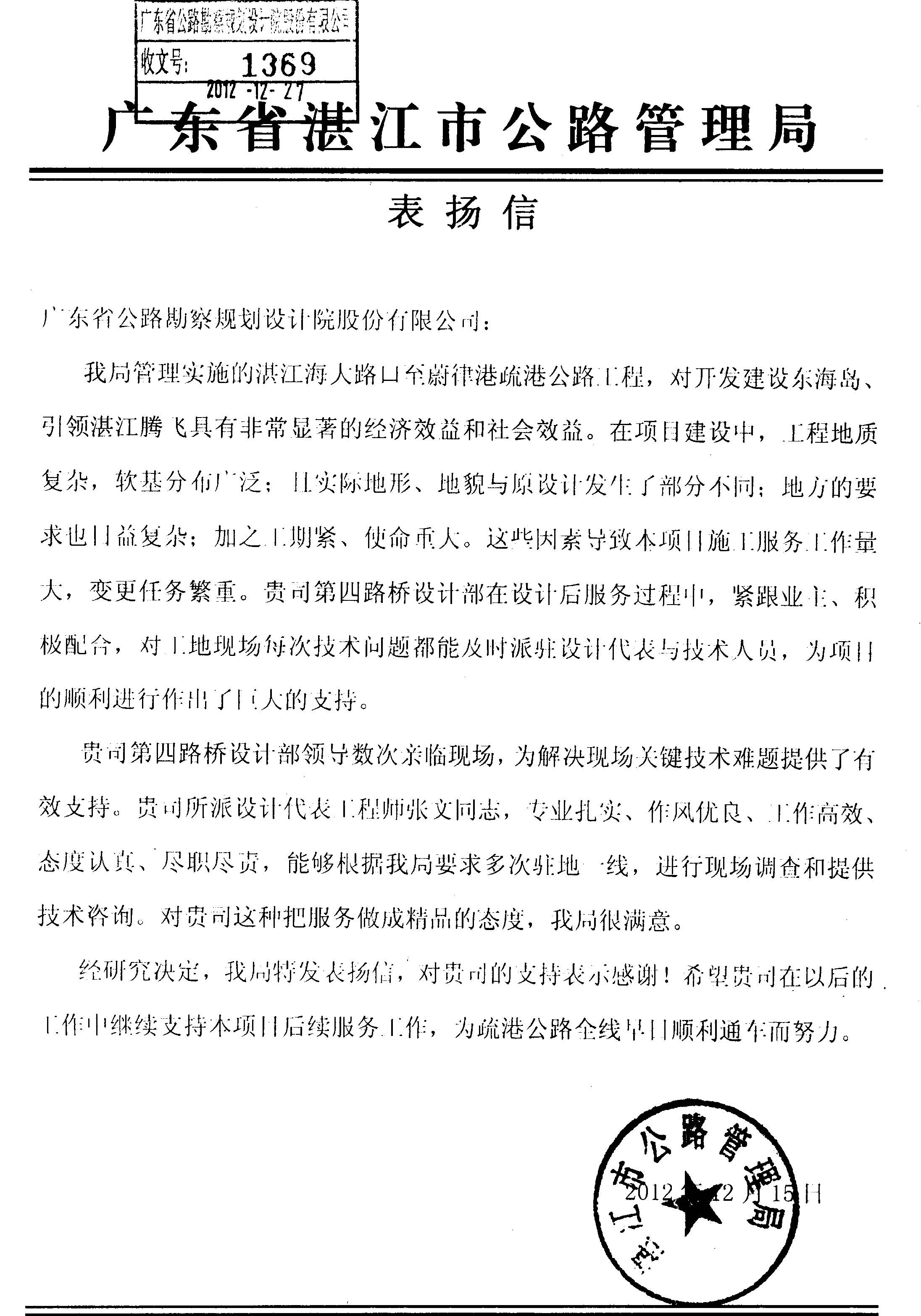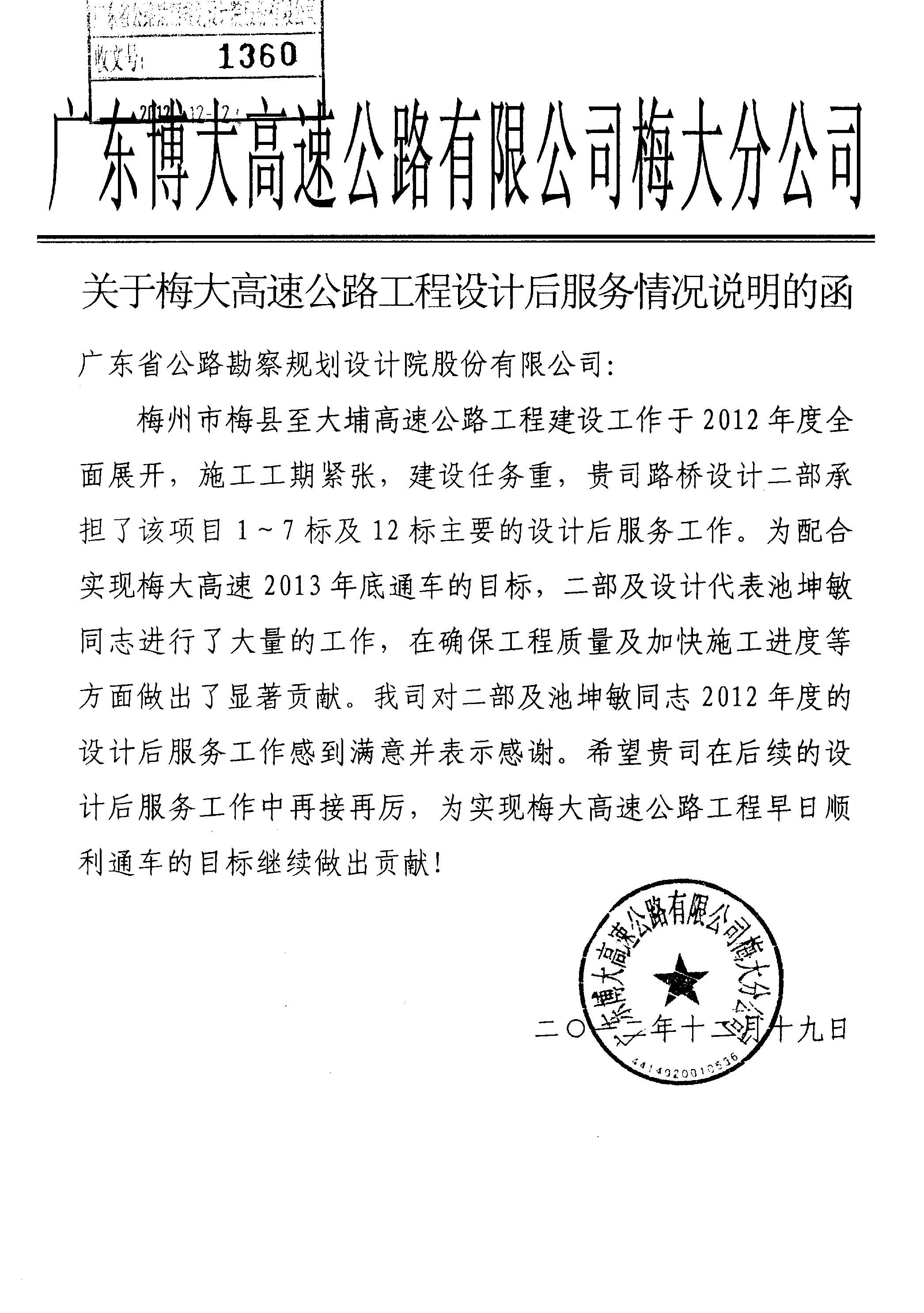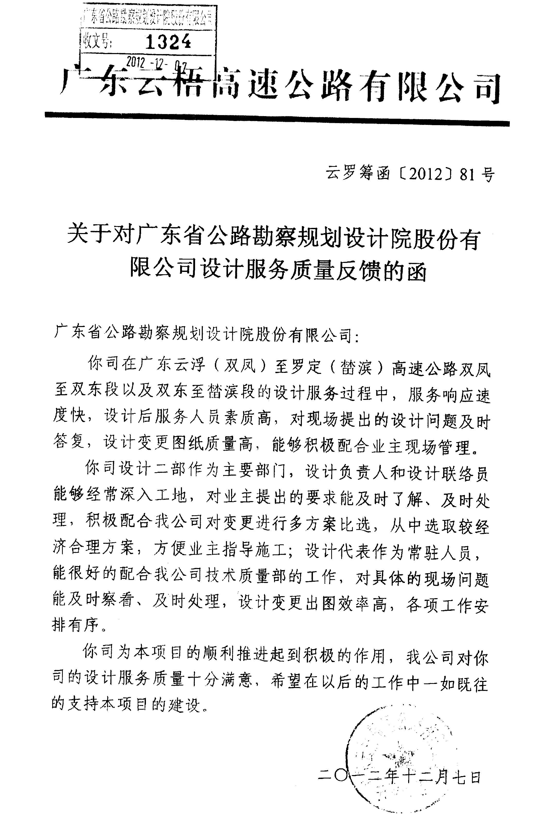 近日,湛江市公路管理局、廣東云梧高速公路有限公司、廣東博大高速公路有限公司梅大分公司等業(yè)主單位紛紛來信來函,對我司提供的優(yōu)質(zhì)的設計后服務表示滿意和感謝。在設計后服務過程中,我司“服務響應速度快,設計后服務人員素質(zhì)高,設計變更圖紙質(zhì)量高”,受到業(yè)主單位的廣泛好評。