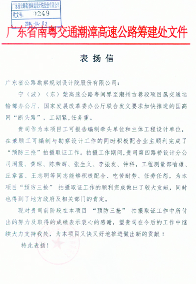 近日,省南粵交通潮漳高速公路籌建處發(fā)來(lái)表?yè)P(yáng)信,對(duì)我司在該項(xiàng)目“預(yù)防三搶”拍攝取證工作中作出的努力表示肯定和感謝。同時(shí),點(diǎn)名表?yè)P(yáng)了第四路橋設(shè)計(jì)分公司及工程測(cè)量部等一批項(xiàng)目組成員。特此報(bào)喜。