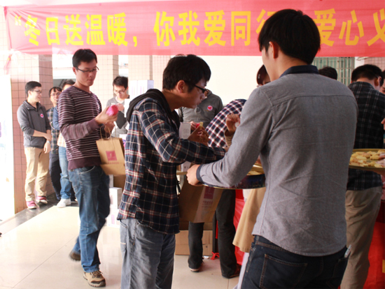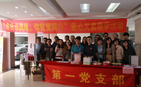 2014年11月17日中午,行政事務(wù)部攜手第一黨支部在2號(hào)樓一樓大堂組織開展“冬日送溫暖,你我愛同行”主題義賣助學(xué)活動(dòng),取得圓滿成功?;顒?dòng)得到了公司領(lǐng)導(dǎo)和廣大熱心員工的積極響應(yīng),100個(gè)“膳魔師”牌保溫杯全部售罄,共籌集善款13516元(含第一黨支部捐助的5500元成本費(fèi)用)。全部善款將兌換實(shí)物捐助給粵北山區(qū)韶關(guān)樂昌市坪石鎮(zhèn)新巖下村的貧困兒童。 義賣活動(dòng)中,第一黨支部熱心的員工還自制了愛心甜品供來往員工品嘗,同時(shí)還精心設(shè)計(jì)了愛心祝???。這種愛心義賣的活動(dòng)形式在公司尚屬首次。