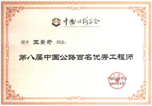 公司王景奇副總工程師近日榮獲“第八屆中國(guó)公路百名優(yōu)秀工程師”稱(chēng)號(hào),并在不久前召開(kāi)的2015年中國(guó)公路學(xué)會(huì)學(xué)術(shù)年會(huì)上獲得了表彰。特此祝賀!
