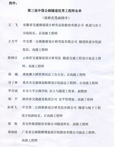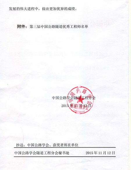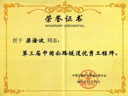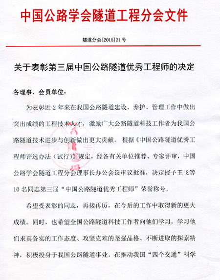 公司梁淦波副總工程師榮獲“第三屆中國公路隧道優(yōu)秀工程師”稱號,并在近日召開的2015年全國公路隧道學(xué)術(shù)年會上獲得了表彰,全國共有10名同志獲得該榮譽(yù)稱號。特此祝賀!