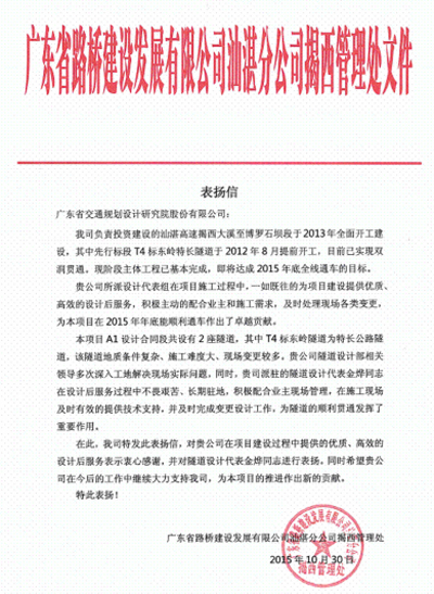 近日,廣東省路橋建設(shè)發(fā)展有限公司汕湛分公司揭西管理處發(fā)來表揚(yáng)信,對我司在汕湛高速揭西大溪至博羅石壩段中提供的專業(yè)、高效、優(yōu)質(zhì)服務(wù)表示贊揚(yáng),同時(shí)對負(fù)責(zé)該項(xiàng)目的隧道設(shè)計(jì)部派駐的隧道設(shè)計(jì)代表金燁同志給予了通報(bào)表揚(yáng)。目前該項(xiàng)目已基本完成主體工程,即將達(dá)成2015年底全線通車的目標(biāo)。