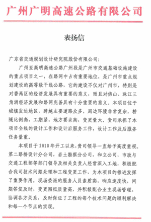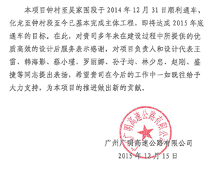 近日,廣州廣明高速公路有限公司發(fā)來(lái)表?yè)P(yáng)信,對(duì)我司在廣州至高明高速公路廣州段中提供的高效、優(yōu)質(zhì)服務(wù)表示贊揚(yáng),同時(shí)對(duì)負(fù)責(zé)該項(xiàng)目的第二路橋設(shè)計(jì)分公司等組織及個(gè)人給予了通報(bào)表?yè)P(yáng)。目前該項(xiàng)目鐘村至吳家圍段于2014年12月31日順利通車(chē),化龍至鐘村段已基本完成主體工程,即將達(dá)成2015年底通車(chē)的目標(biāo)。