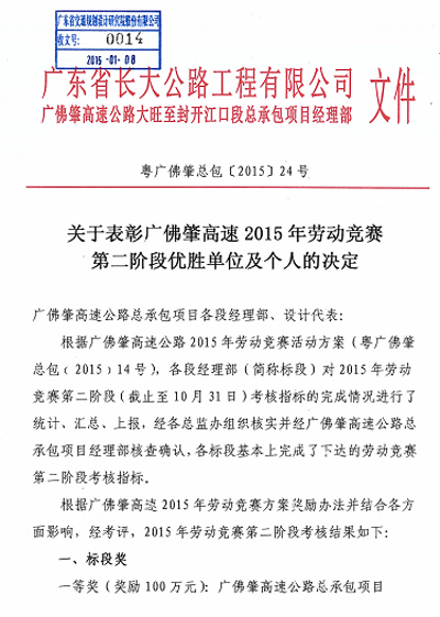 近日,我司第五路橋設(shè)計分公司駐廣佛肇高速公路大旺至封開江口段設(shè)計代表牟鍵超同志受到廣東省長大公路工程有限公司廣佛肇高速公路大旺至封開江口段總承包項目經(jīng)理部表彰,榮獲廣佛肇高速2015年勞動競賽第二階段 “優(yōu)秀設(shè)計代表”稱號。特此報喜。