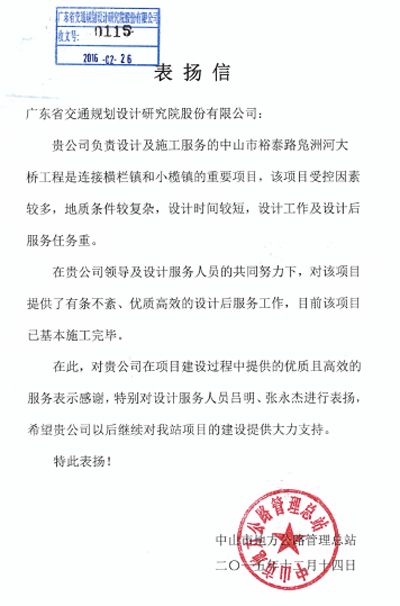 近日,中山市地方公路管理總站發(fā)來表揚信,對我司在中山市裕泰路鳧洲河大橋工程中提供的高效、優(yōu)質的設計后服務表示贊揚,同時該項目所屬的第一路橋設計分公司及設計代表呂明、張永杰等個人給予了通報表揚。特此報喜。