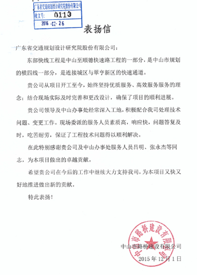 近日,中山市路橋建設(shè)有限公司發(fā)來表揚信,對我司在東部快線工程中的提供的高效、優(yōu)質(zhì)的設(shè)計后服務(wù)表示贊揚,同時該項目所屬的第一路橋設(shè)計分公司及設(shè)計代表呂明、張永杰等個人給予了通報表揚。特此報喜。