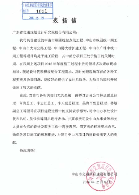近日,中山市交通項(xiàng)目建設(shè)有限公司發(fā)來表揚(yáng)信,對我司在中山市縱四線起點(diǎn)段工程、中山市縱四線一期工程、中山市大南公路工程、中山港大橋擴(kuò)建工程、中山市廣珠中線二期工程等項(xiàng)目中提供的優(yōu)質(zhì)、高效、負(fù)責(zé)的設(shè)計(jì)后服務(wù)表示贊揚(yáng),同時(shí)對我司第一路橋設(shè)計(jì)分公司有關(guān)人員給予通報(bào)表揚(yáng)。特此報(bào)喜!