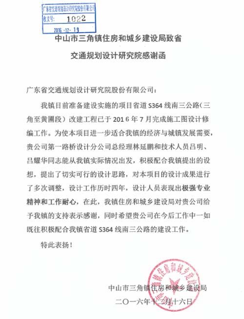 近日,中山市三角鎮(zhèn)住房和城鄉(xiāng)建設局發(fā)來感謝函,對我司第一路橋設計分公司等組織和設計人員在省道S364線南三公路(三角至黃圃段)改建工程的施工圖設計修編工作中能考慮實際情況,多次進行設計修編,表現(xiàn)出極強的專業(yè)精神和工作耐心表示高度贊揚,同時對我司的支持工作表示感謝。特此報喜!